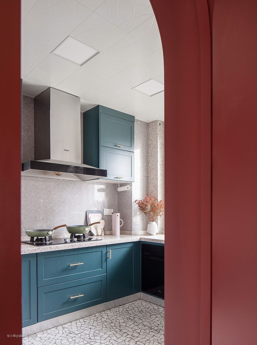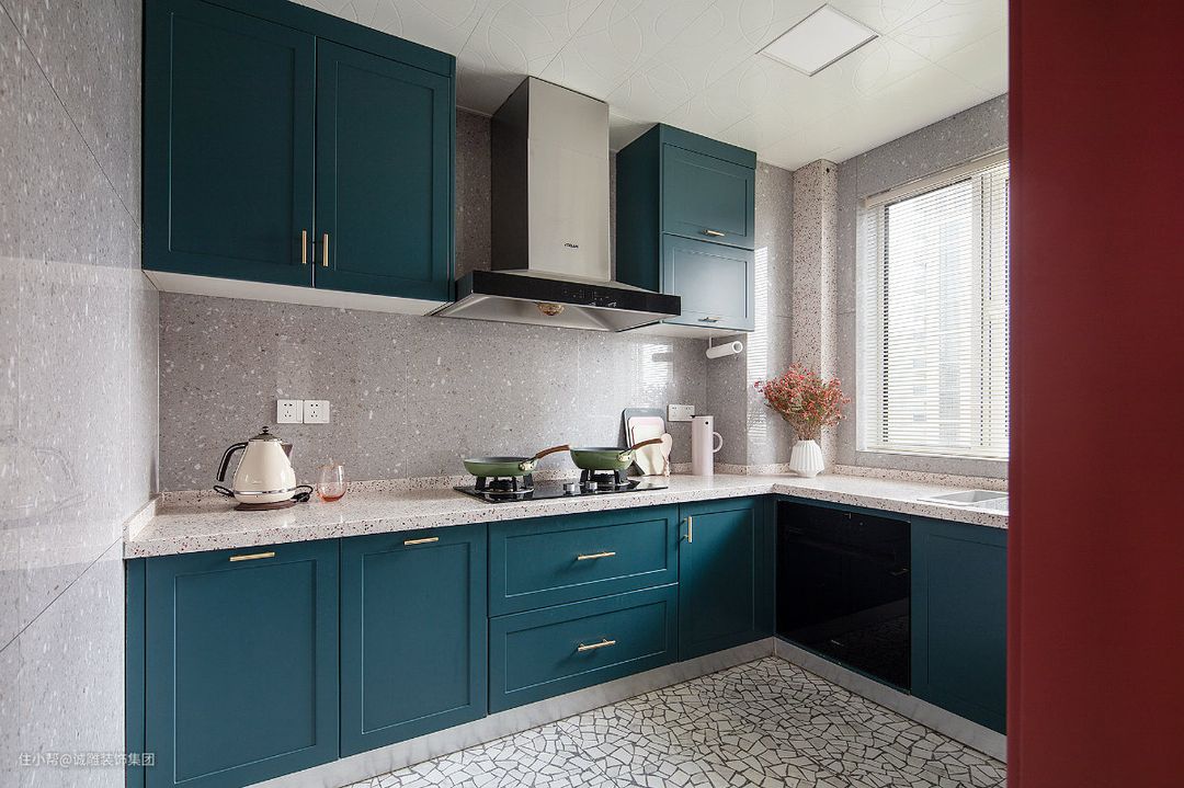 厨房里看起来很清爽,干净, 灰色搭配上蓝色清新优雅, L型的布局使用起来也十分方便,同时也增加了厨房储物空间。