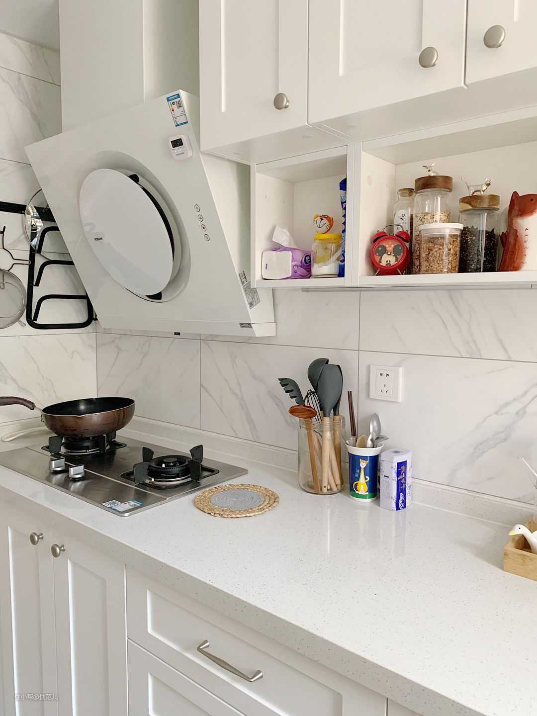 都说收纳是简洁厨房老大难,白色组合橱柜做满增加储物,搭配黑色置物架放瓶瓶罐罐整齐又好取放。 颜值超高的白色侧吸式油烟机,几乎与橱柜融为一体降低存在感,喜欢清新调厨房又要百搭颜值首选。