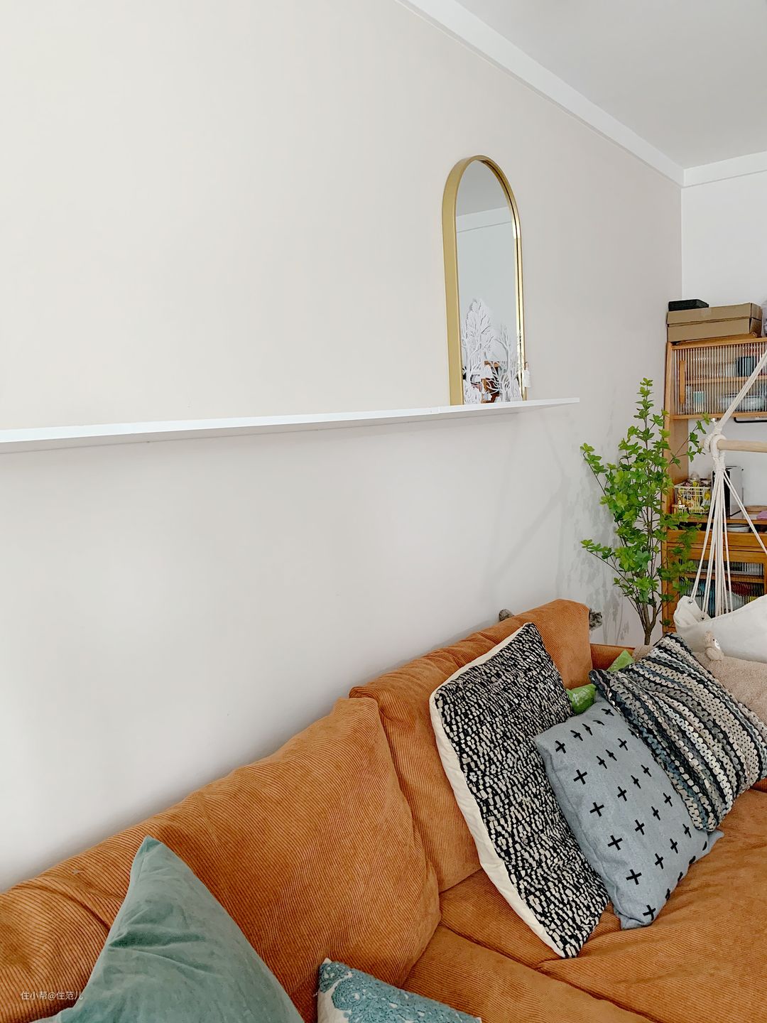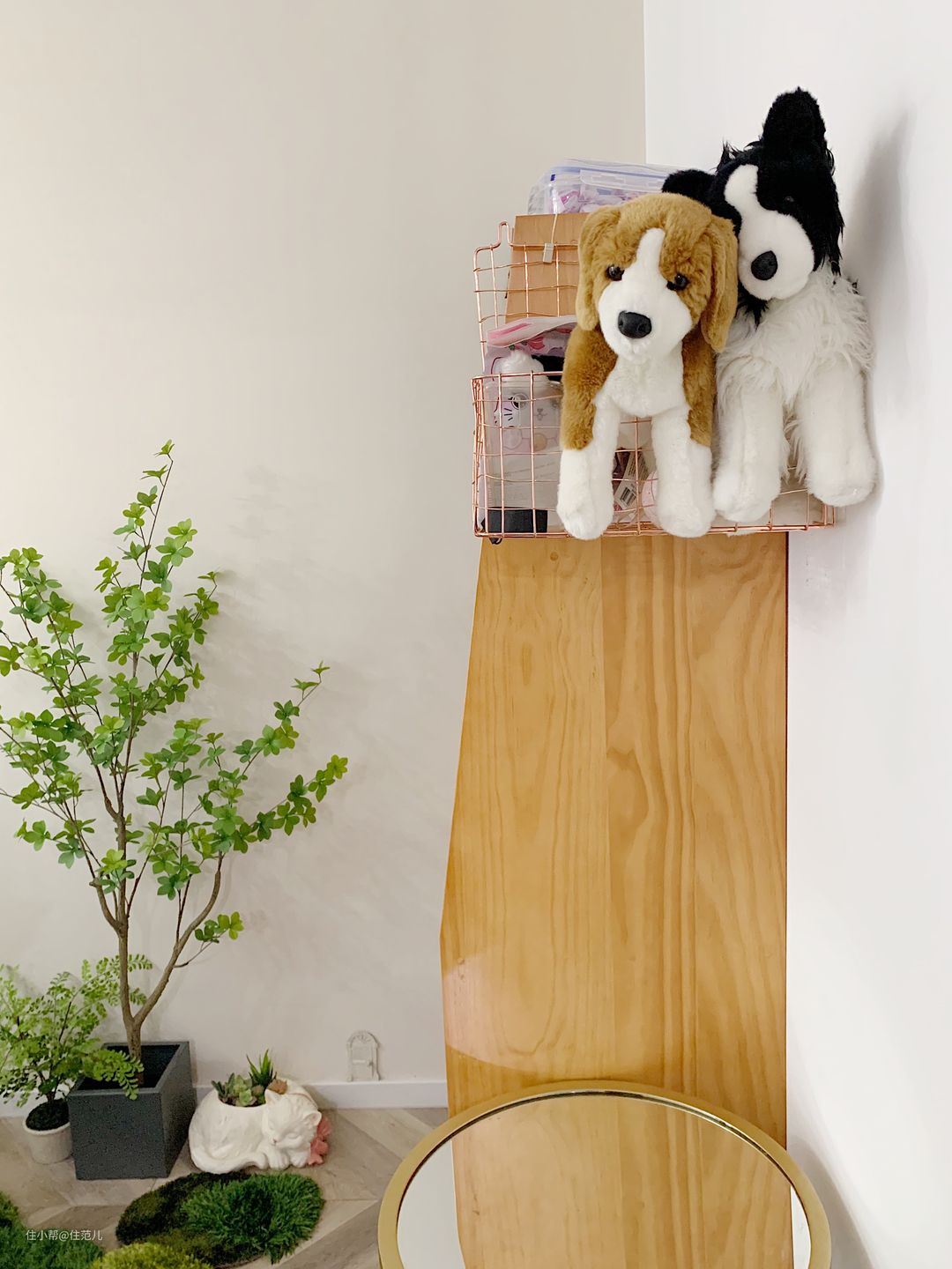 沙发背景墙做了长2.4米,三块80×20cm拼接而成的置物板,用来摆放可可爱爱的公仔和装饰镜,对于整个客厅空间的拉伸视觉感一级棒。