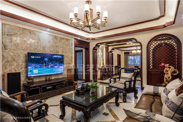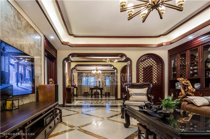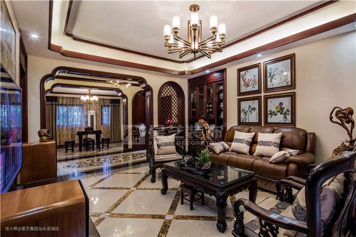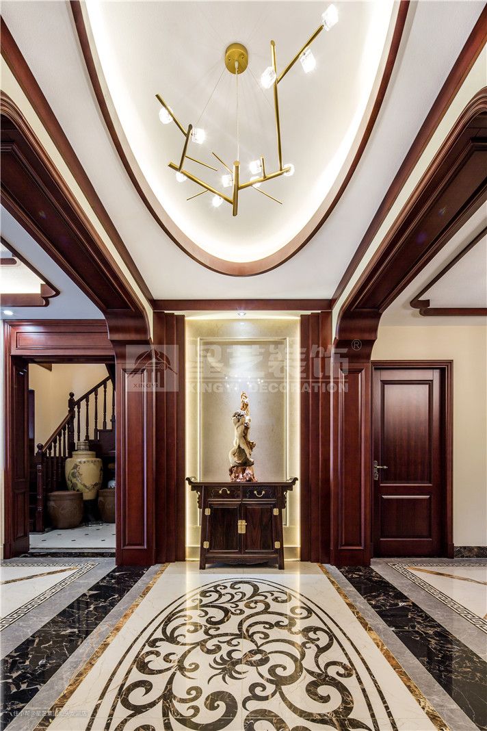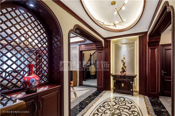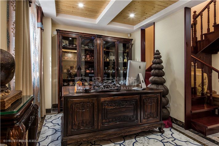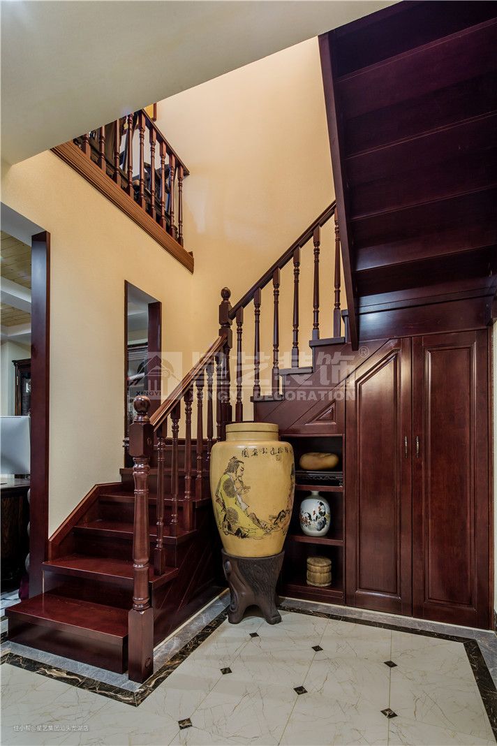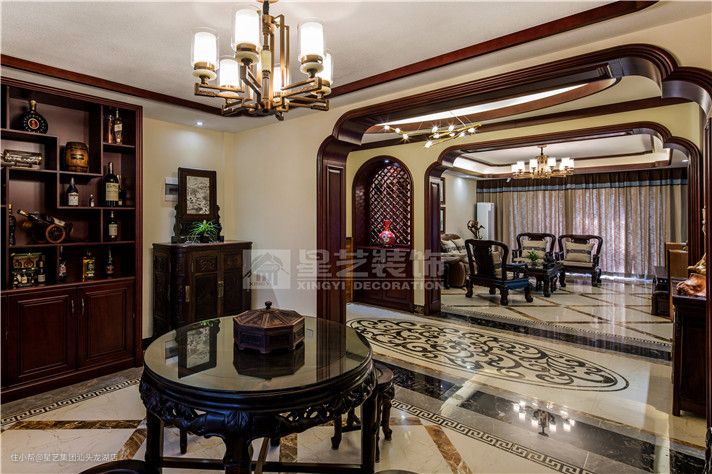 设计风格:新中式风格 面积:180平方 户型:复式楼 主要材料: 尤加利木 艺术涂料 陶瓷 石材等 设计说明: 尽览古韵风采,演绎新式风华。这是设计师对本案的情怀,整体空间装饰都采用简洁简约的线条,干净随性。无论是家具、装饰还是硬装的处理,都迎合了现代人对中式家具追求的内敛、质朴分格。整体空间也更加实用、富现代感。而素雅的黄色调与厚重的木色,在灯光的反衬下,更显舒适时尚、层次丰富、空间感强。而展示柜上的精妙小品,造就了可细琢的一景。整体空间感更加丰富,大而不空、厚而不重,有格调又富艺术气息。 本案在结构上也做了较大调整。原结构空间没有层次,原楼梯与整体空间没有互动,没有独立的餐区,原卫生间没有采光等诸多问题。经过设计师的精心安排,进入空间,映入眼帘的是富有艺术气息的玄关区,让整体空间层次丰富、富有内涵和气质。有了独立的餐区,让饮食赋予享受、赋予健康。楼梯与书房之间的半开放式处理,让彼此空间有了更多的交流,让采光和通风上升新的高度,让整体空间更加流畅与和谐。
