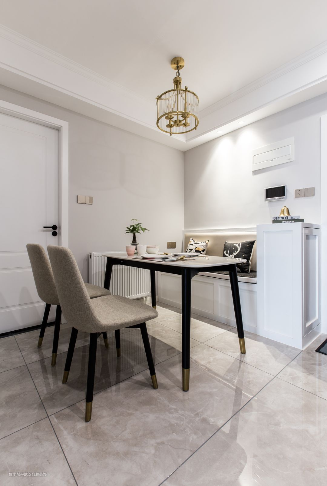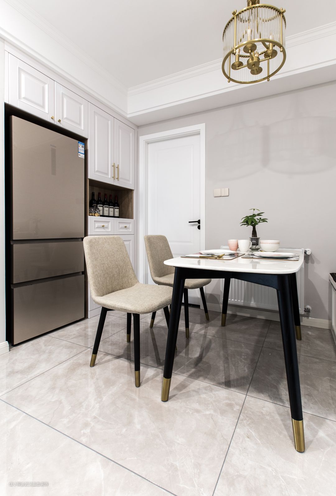 餐厅的面积并不大,我们设计了舒适的卡座,将小空间转化为一个半私密的交流空间,用餐的同时也是和家人增进感情的好去处。靠墙的一面是酒柜和冰箱,更加方便了业主存放东西。桌面和凳子用了较为温柔耐脏的颜色,金色的桌凳脚和小巧的餐厅灯更能烘托出用餐的温馨氛围。