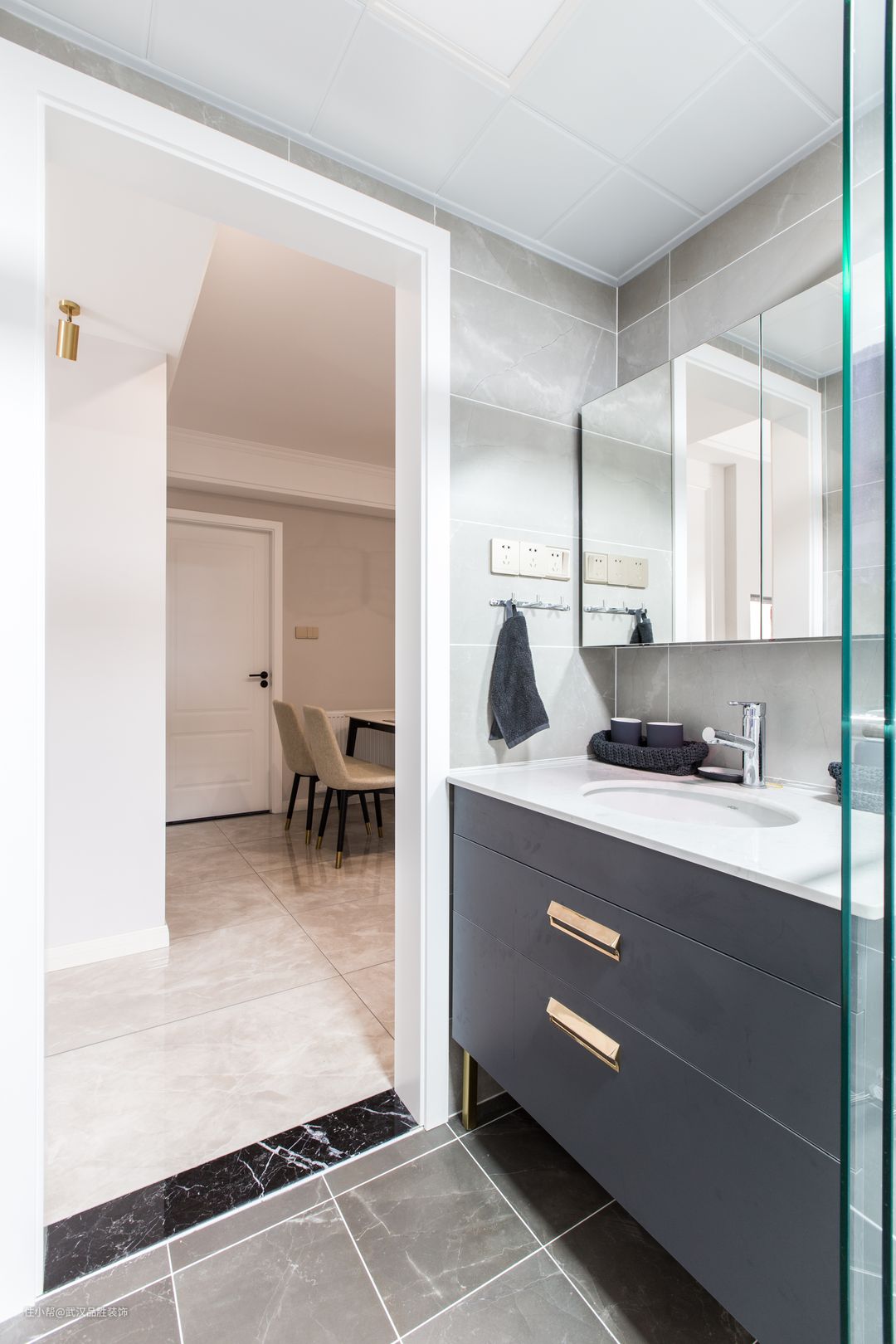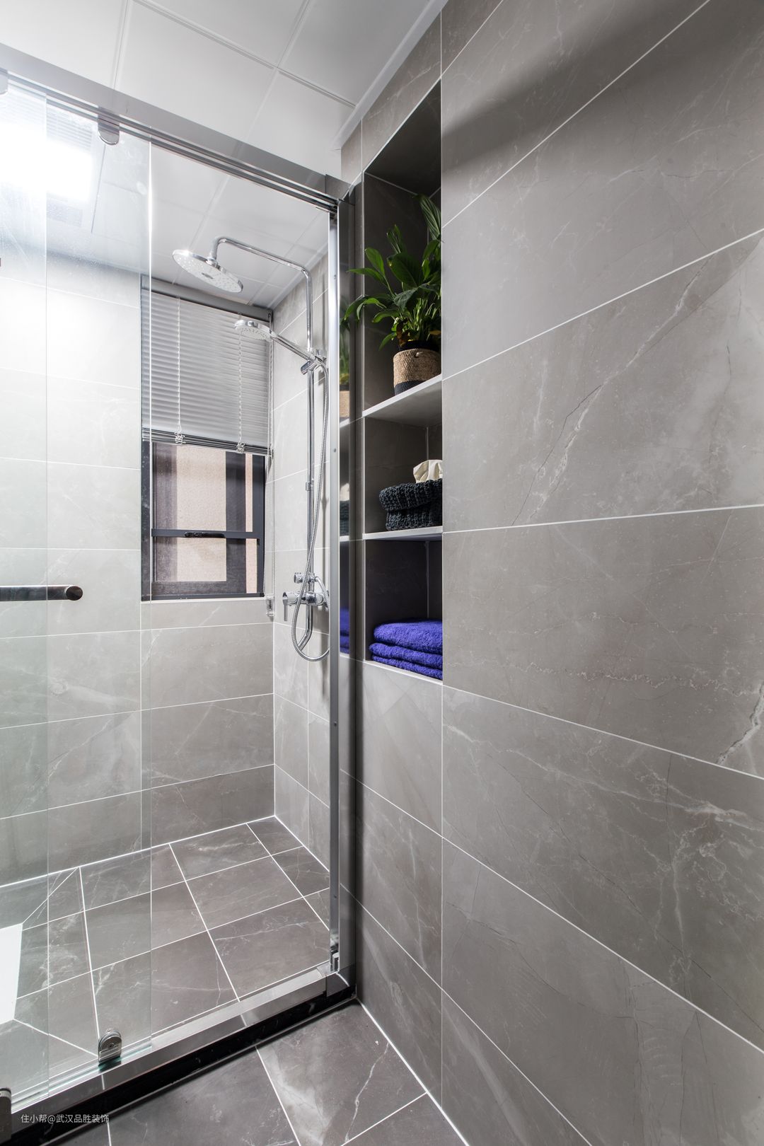 卫浴间整体采用了灰色的瓷砖,其中点缀并不明显的花纹,轻奢风的独特魅力就是这样,细节中带给人不一样的情致风雅。隔间用玻璃门隔开,使得卫浴间中的光线更加明亮通透,空间格局更为合理。