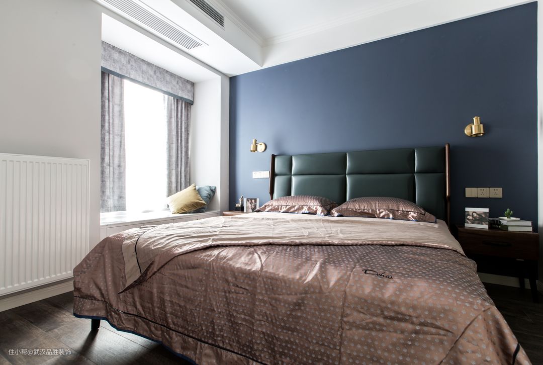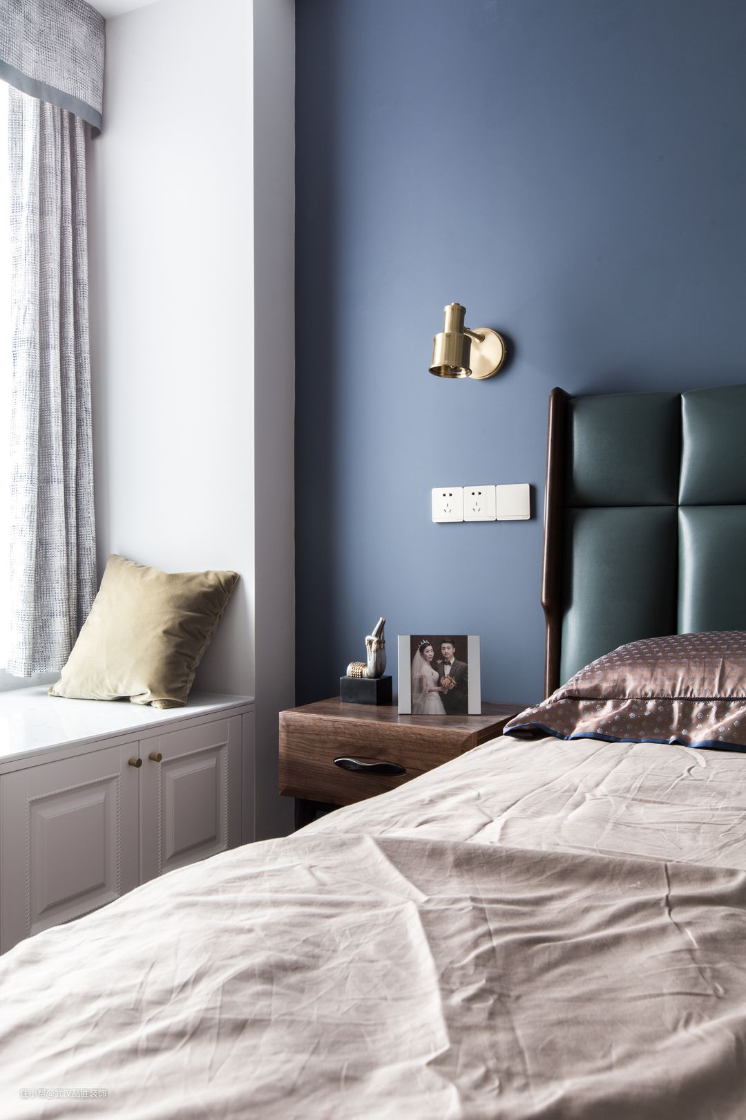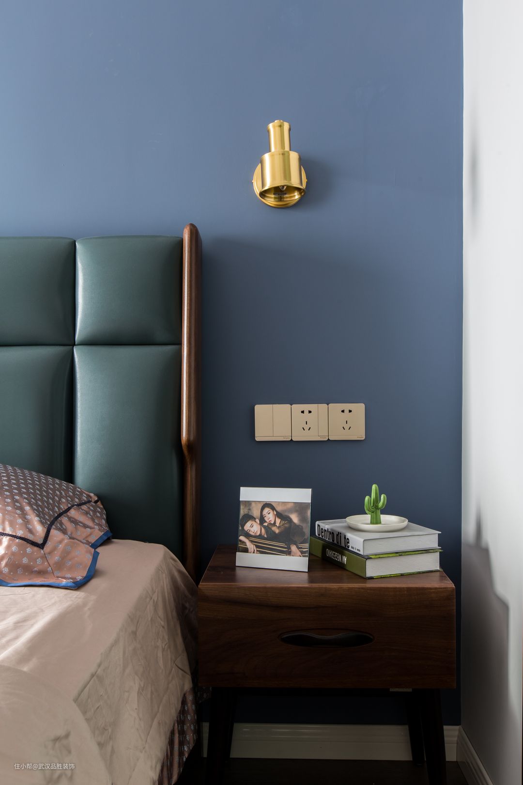 整面深蓝色调的背景墙与金色灯具的搭配显现出一种低调的奢华感,与客厅形成了一种舒适的反差,让业主在这个空间中能找寻到更加宁静的梦,一个十分安稳的休息空间。