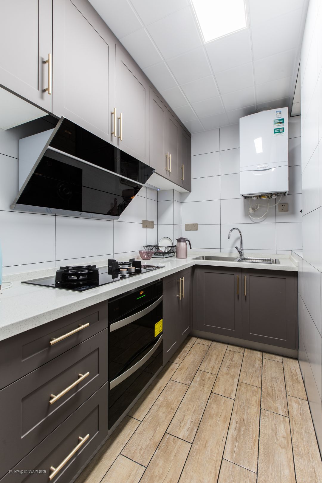 长条形的厨房虽然有些小,但是五脏俱全。整体的操作台并没有缩水多少,给了业主更多操作空间,以及合理的动线分布。整体中规中矩,更加偏向实用性,减少了拐角给业主带来的清理不便。