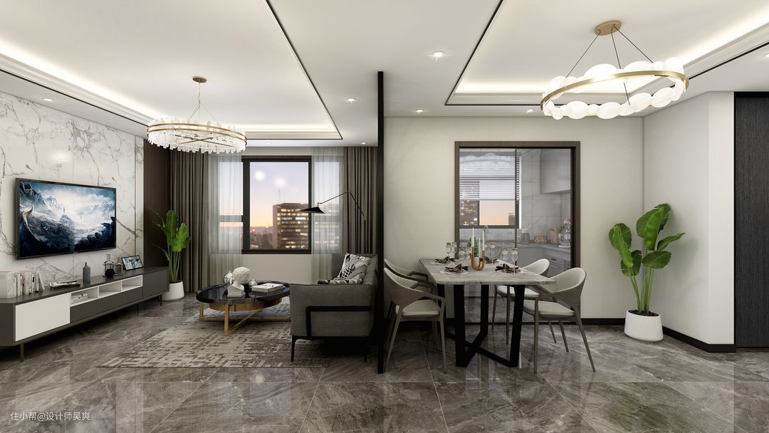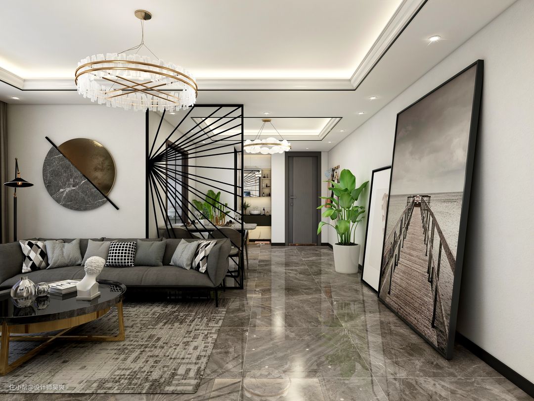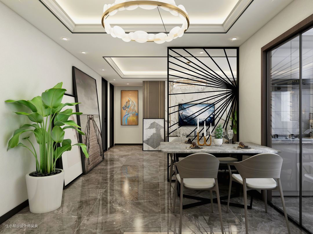 餐厅利用简约隔断将客餐厅区域划分,通过挂饰和隔断的呼应,体现强烈的艺术感!