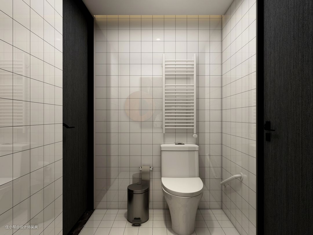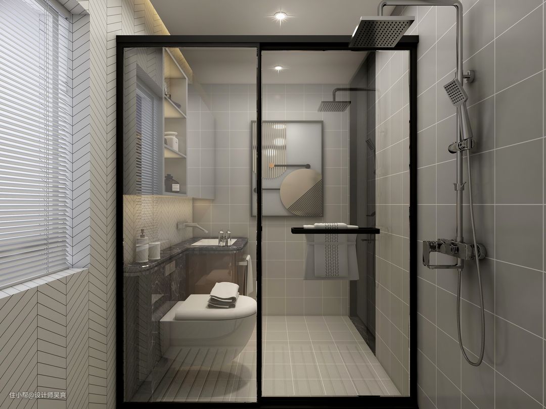 淋雨和马桶各自独立,干湿分离,马桶上方设有置物柜,可以收纳洗漱用品,更好的利用空间