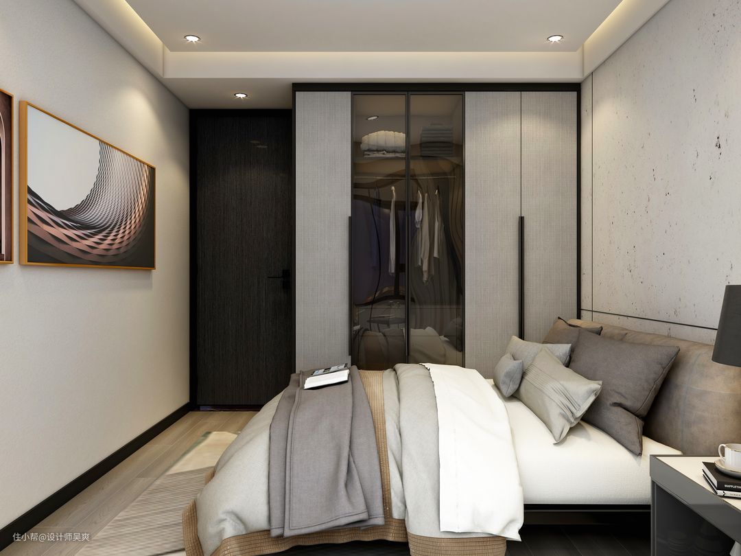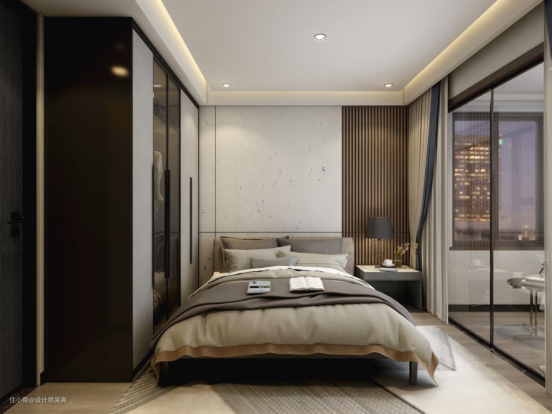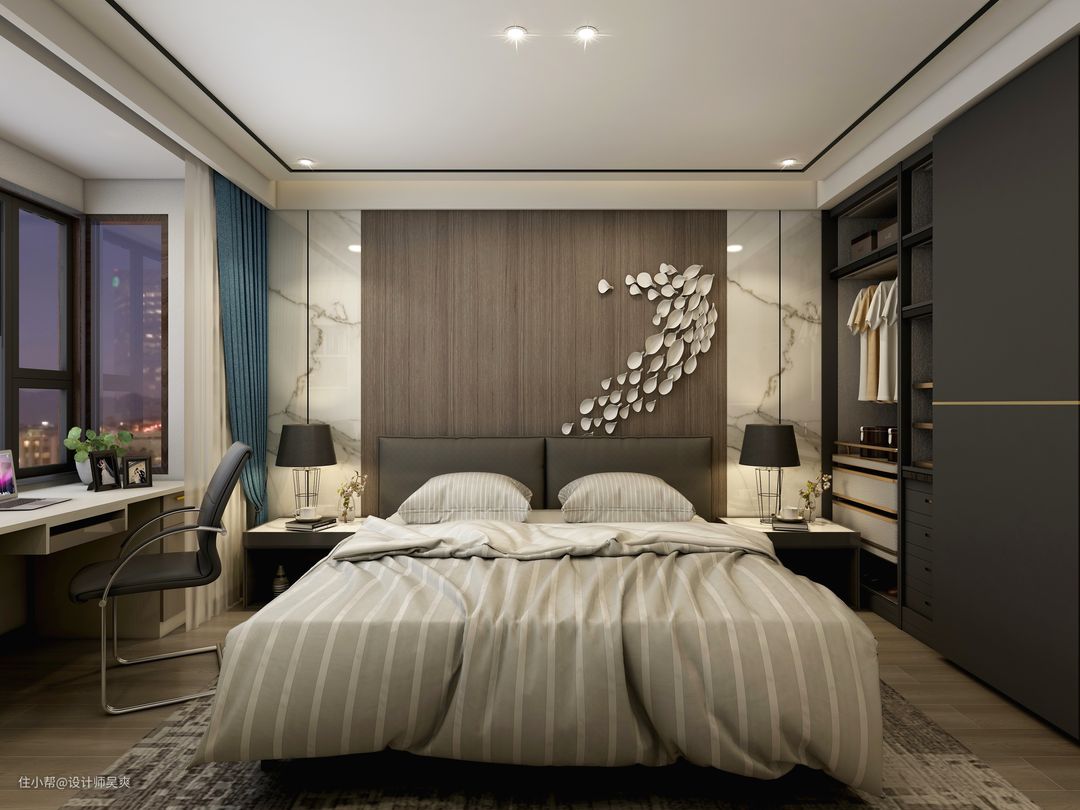 床头背景使用石材+木材,设计而成得床头造型,简单富有立体感,将原有的飘窗拆除,改造成办公书桌,搭配黑色柜体推拉门,和米白色墙面,整个空间宁静高冷