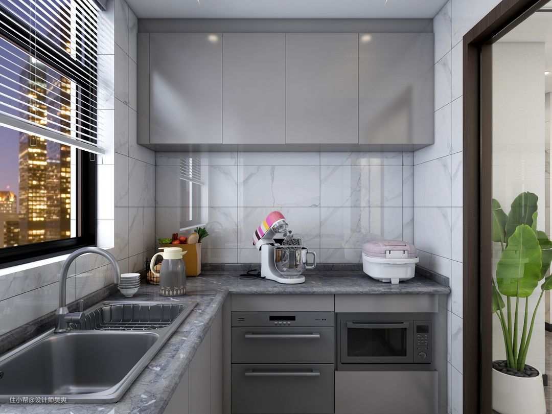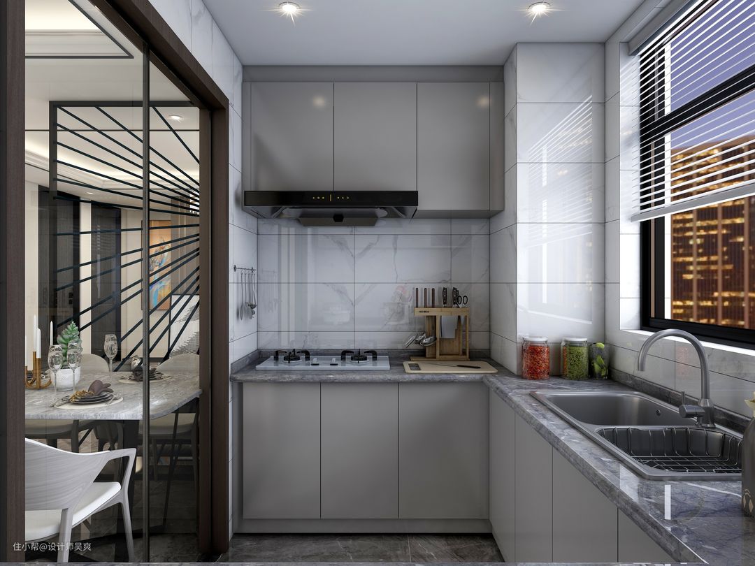 厨房墙面使用白色瓷砖,搭配深灰色橱柜,层次分明,整体橱柜的设计,最大限度得利用厨房面积!