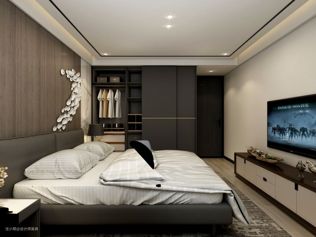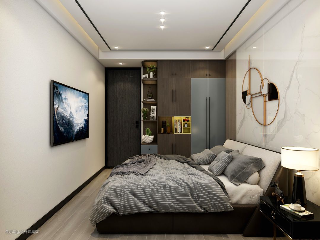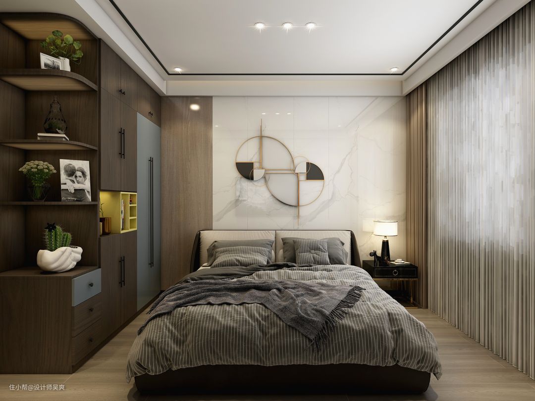 次卧同样石材上墙,木饰面勾芡,采用无主灯设计,让空间得温度与理性达到平衡的状态