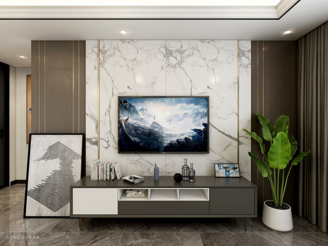 客厅电视墙采用木饰面和大理石搭配,外加钛金条装饰,增加空间的整体性和立体感