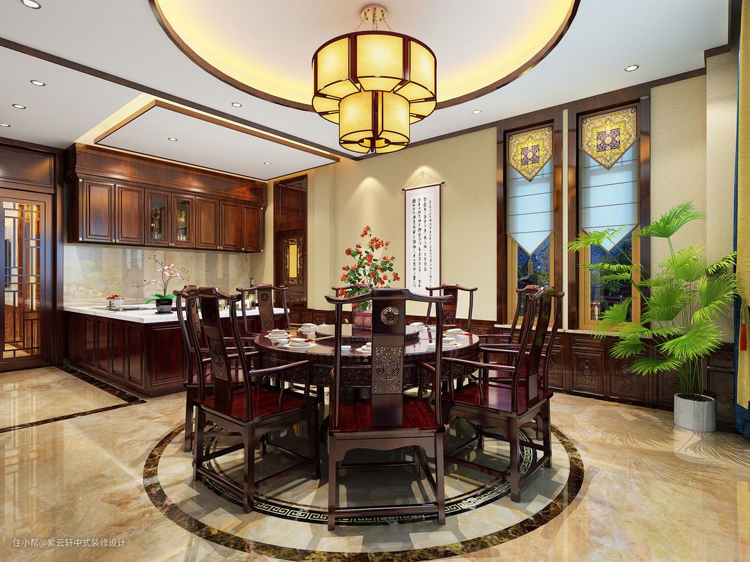 大餐厅中式装修,一张圆餐桌放置在中间,与头顶的绚美大灯相应和,左侧的墙上挂着四幅雕画,烘托出了中式的文雅情怀。