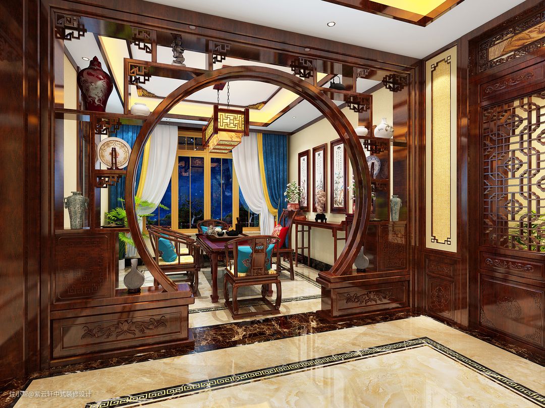 客厅中式装修,走进来环顾四周,挑高的设计使得空间格外广阔,那震撼的场景让人心胸开阔,极具视觉冲击力和精神感染力的设计感,碰撞出明清贵族的雍容与高贵!!