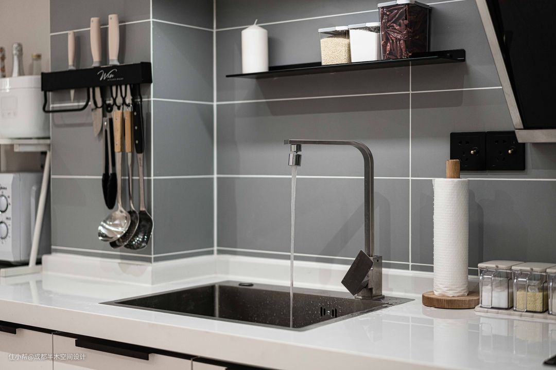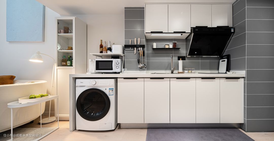 大显身手的精致小厨房。灰色哑光砖,搭配白色橱柜+吊柜,清新整洁,足够的收纳空间才能保证空间的整洁,避免杂乱感。