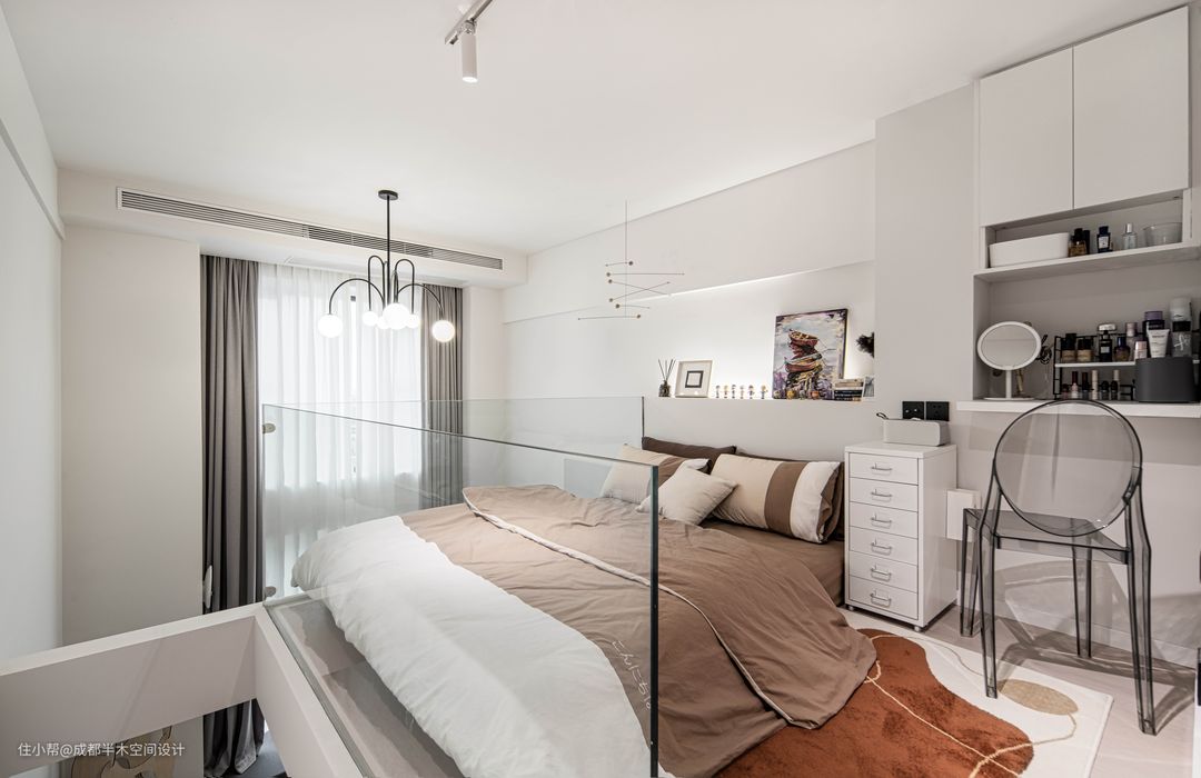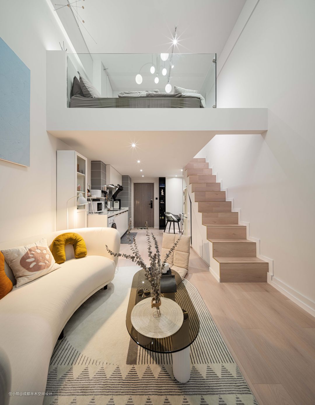 Q:装修过程花了多长时间? A:3个月 Q:原始户型存在哪些问题? A:户型本身面积偏小,套内使用面积单层只有23个平方左右,半搭的设计更使得二楼空间减小,赠送的楼梯间就更需要利用起来 Q:对平面布局做了哪些优化改动,为什么?解决了哪些问题? A:4.7的层高做了钢结构半搭,保留了挑高增加了整个空间的采光性。靠窗位置,楼梯下方还有赠送的楼梯间都相应做了储物功能,楼梯间改做衣帽间,L型开放式衣架满足一切衣物收纳,进门靠墙位置做一整面鞋柜。足够的收纳空间才能保证空间的干净避免杂乱感。 Q:说说是什么给了你灵感,打造出现在这个作品的? A:因为本身对loft空间的喜爱,与客户本身观念的契合 Q: 整个作品中最满意的是哪里? A:半搭设计保留了空间的挑高,玻璃扶手让卧室和整个空间结合的通透干净,各个空间小而实用。弧形沙发椭圆形玻璃茶几以及圆形倒角地毯也相互呼应,使得氛围温馨感十足。 Q:在整个装修设计期间遇到最大的挑战是什么? A:本身空间的狭小,还要做半搭设计,相应就会压缩每一个功能空间的使用面积,例如卧室区域卫生间还有楼梯。 Q:回头再看这套房子,设计当中有什么遗憾的地方吗? A:搭建时由于搭建方理解问题,没有在工字钢中间做混泥土现浇,而是为了稳固性在工字钢以上做混泥土,使得二楼层高压缩了10公分左右。 Q:你在设计过程中做了哪些个性化改造? A:楼梯没有做扶手,楼梯简做十一步退出了投影空间。二楼栏杆也采用了全玻璃形式使得整个空间更显开敞明亮。本身的下水管道位置做了包管处理后做了床头以及梳妆台,使得包管位置不显突兀,加上灯带后氛围感十足同时兼具展示和置物功能。卫生间小而精致,墙排马桶解决下水管道问题,利用空间做了壁龛方便放置洗漱用品,洗手盆外置白色的立柱盆与空间协调,白色1.6高细长柜体满足收纳,电热水器移至衣帽间解放卫生间空间。衣帽间因为地台高度和粱没有做门而是定制了门帘,同时没有做传统柜体而选择了成品衣架。复古冰箱旁一米长书桌满足办公需求。因为都是开敞的空间也就没有用传统的空调柜机或挂机,直接做了3p风管机,满足了制冷制热的需求。 Q:在案例中有哪些装修经验可以分享,或好物推荐? A:在开间比较小的空间做搭建可以直接在工字钢中间做混泥土浇制一样能满足稳定性。小空间楼梯部分可以适当做做减法不用扶手(当然需要结合业主本身属性,有小孩的家庭不推荐)。地板考虑成本没有选用多层实木,摒弃了传统土气的地板收口条,网购了截面更小的地砖收口条,安装师傅很给力,完成后楼梯地板阳角收口完美精致。