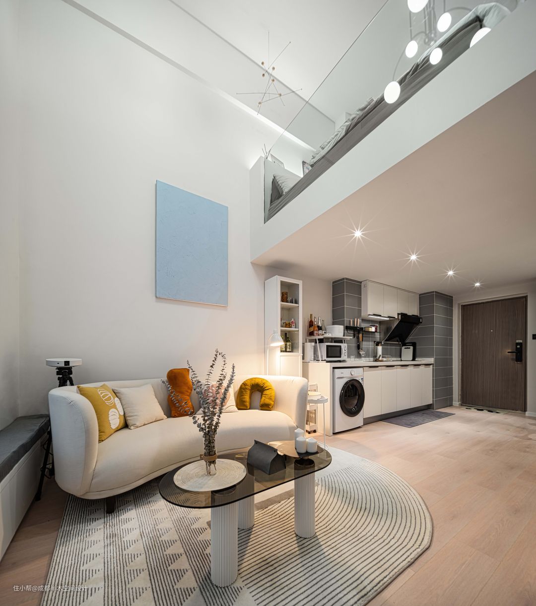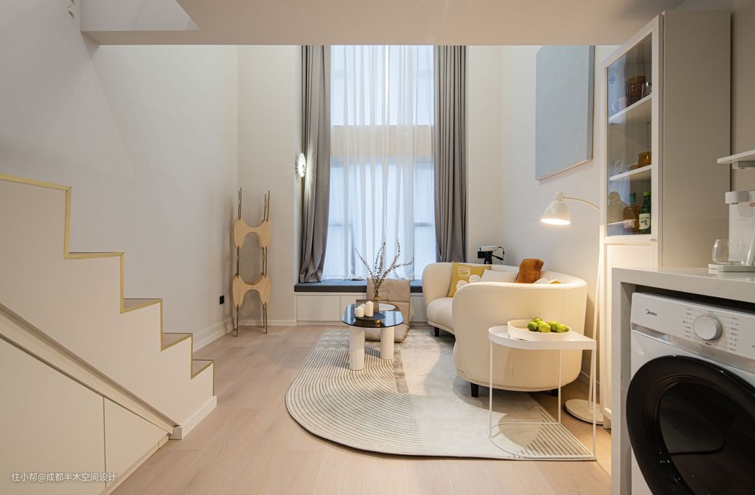 我们在靠窗的客厅区域保留原始的挑高空间,增加了客厅的日照体验,带来了良好的采光,整体设计以浅色为基底,干净通透,搭配精致小巧的家具,让小空间在满足功能性需求的同时,拥有时髦的设计品位。