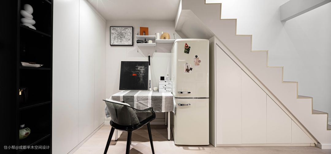 考虑到屋主平时会自己下厨的习惯,在有限的空间内满足日常下厨的基本功能需求,电磁炉、水槽与楼梯间下方的冰箱则组成三角形的厨房动线区域,使用起来流畅便利。