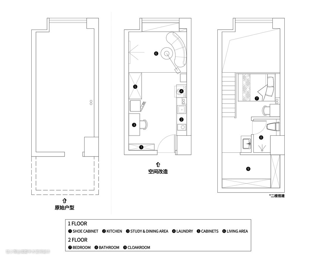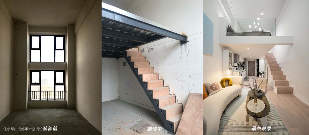 装修前后对比如图,考虑到成都地区的采光本就不是太好,所以“半搭”的方式能够尽可能的保有LOFT户型双层采光优势。同时配合北欧简约风的软装搭配,最终案例的完成效果时髦感十足。