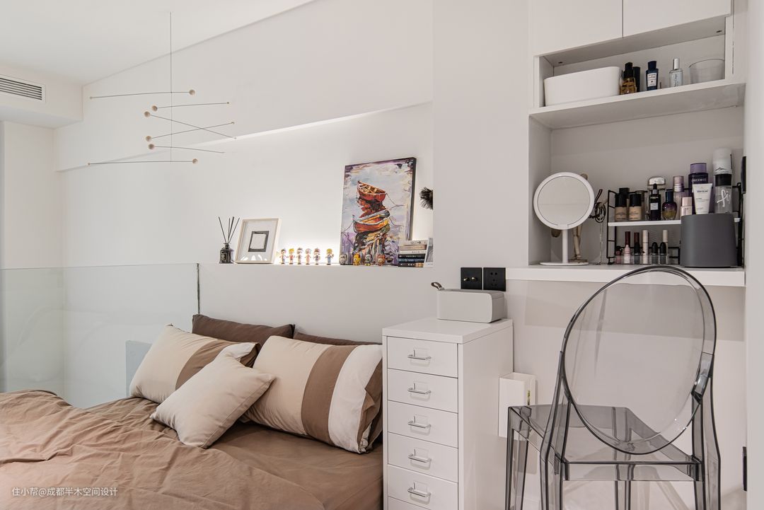 床边的梳妆台其实是用壁龛+定制柜组合出来的,有效利用空间,再配上一把幽灵椅简约而时尚。