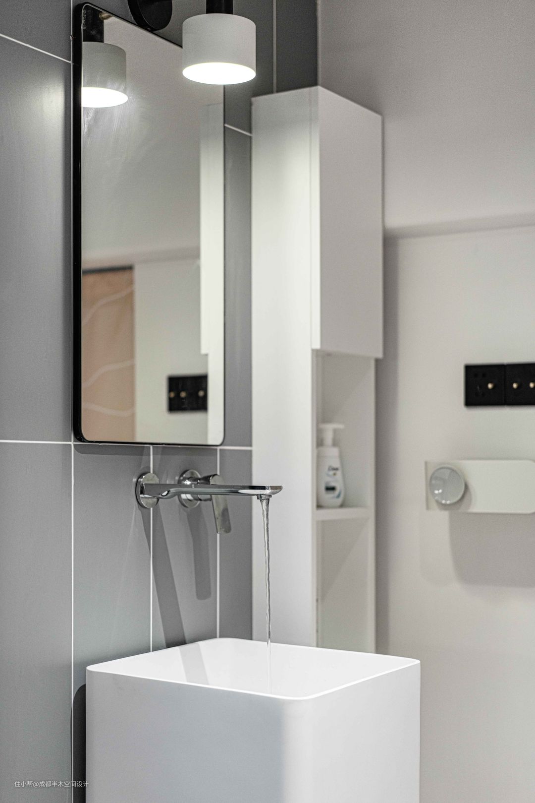 卫生间基本上算是极限尺寸了,采用了洗手台外置的方式来提升利用率。白色的立柱盆与空间协调,白色1.6高细长柜体满足收纳。