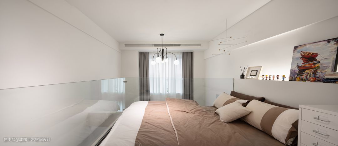 二楼栏杆采用了全玻璃形式,让卧室和整个空间完美结合,使得整个空间更显开敞明亮。