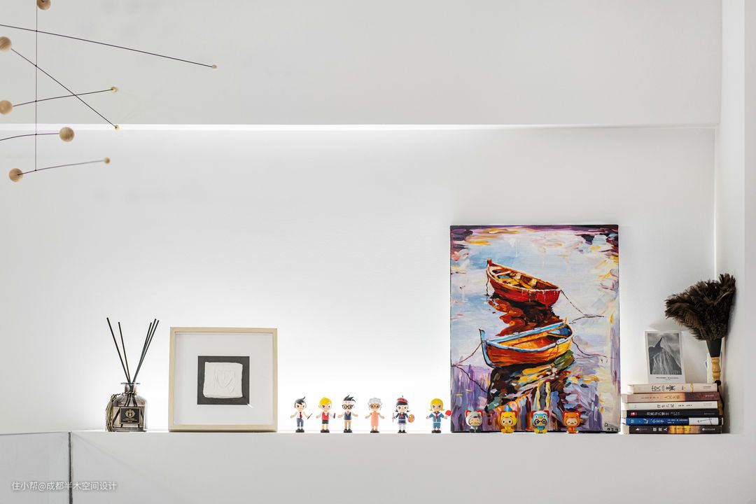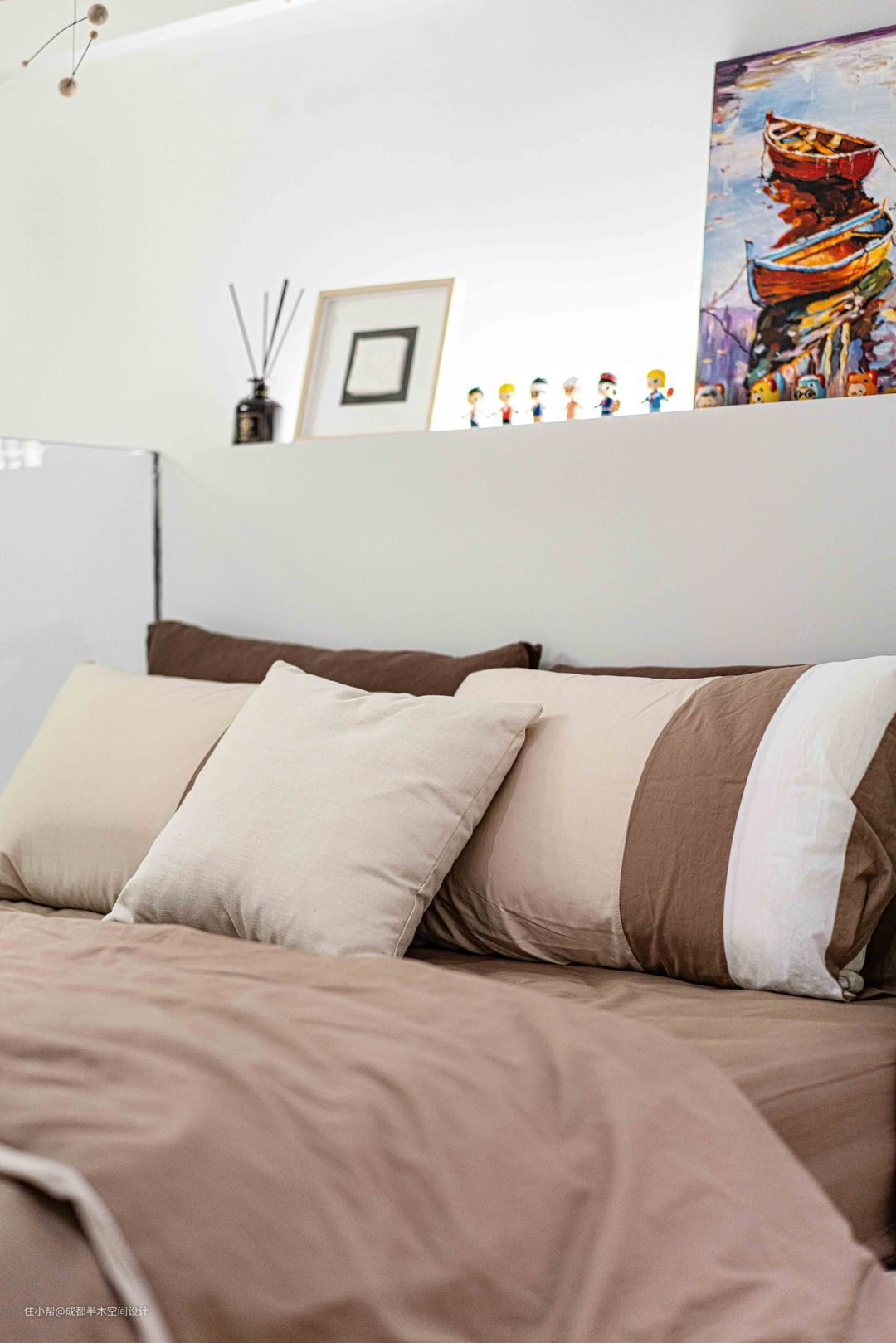 本身的下水管道位置尴尬,做了包管处理后,索性改造成了现在看到的床头矮墙以及梳妆台,使得包管位置不显突兀,加上灯带后氛围感十足,同时兼具展示和置物功能。