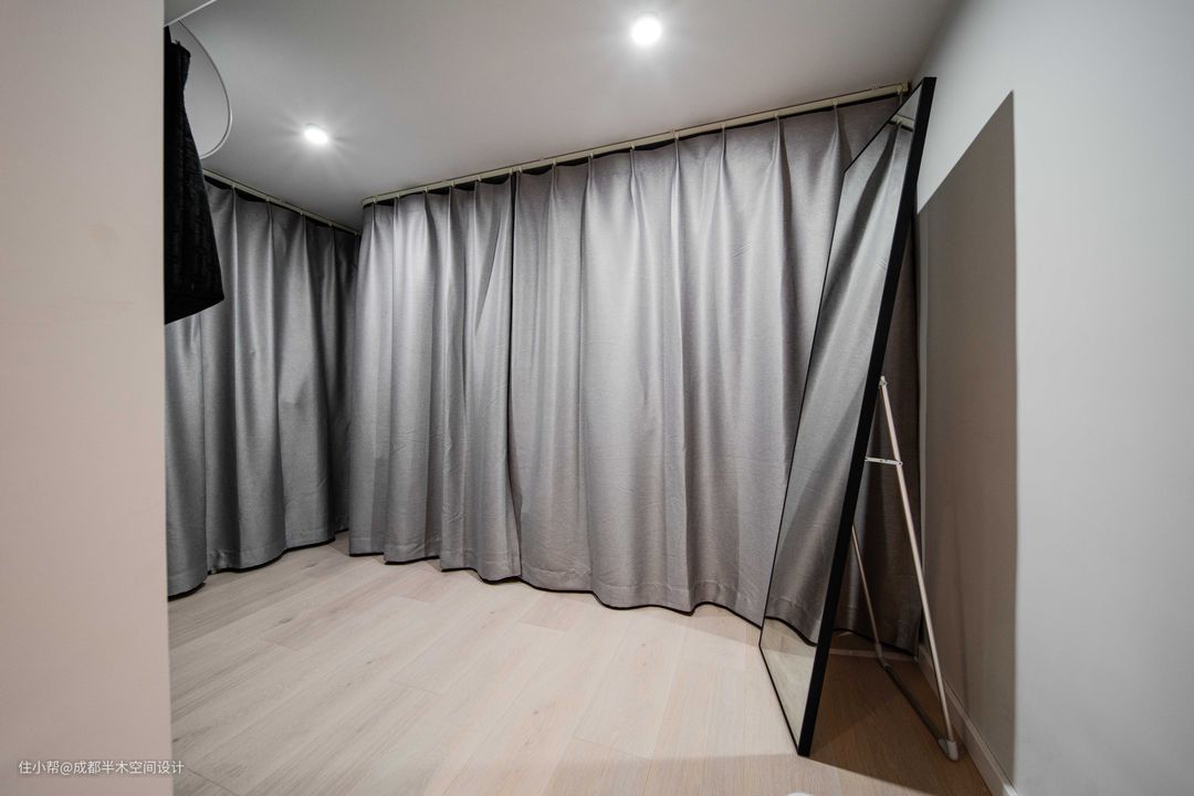 开发商赠送了一个半高的楼梯夹层,把它利用起来做成了衣帽间。L布局的组合式衣架经济实用,再配上一组灰色拉帘干净整洁。