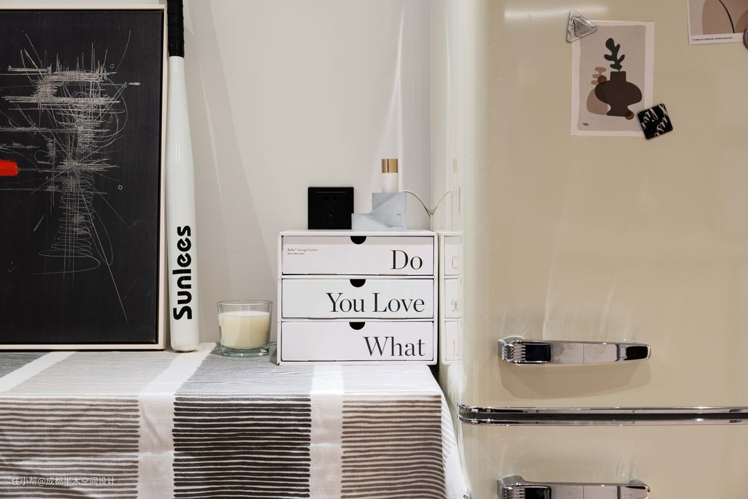 靠墙的桌子可随意切换书桌和餐桌功能,折叠凳放置于储物柜中,解放了客餐厅空间。平时这里就作为一人居的书桌使用——铺上清爽简约的桌布,摆上喜欢的挂画和收纳摆件,成为令人心绪安静沉淀的家中居心地。