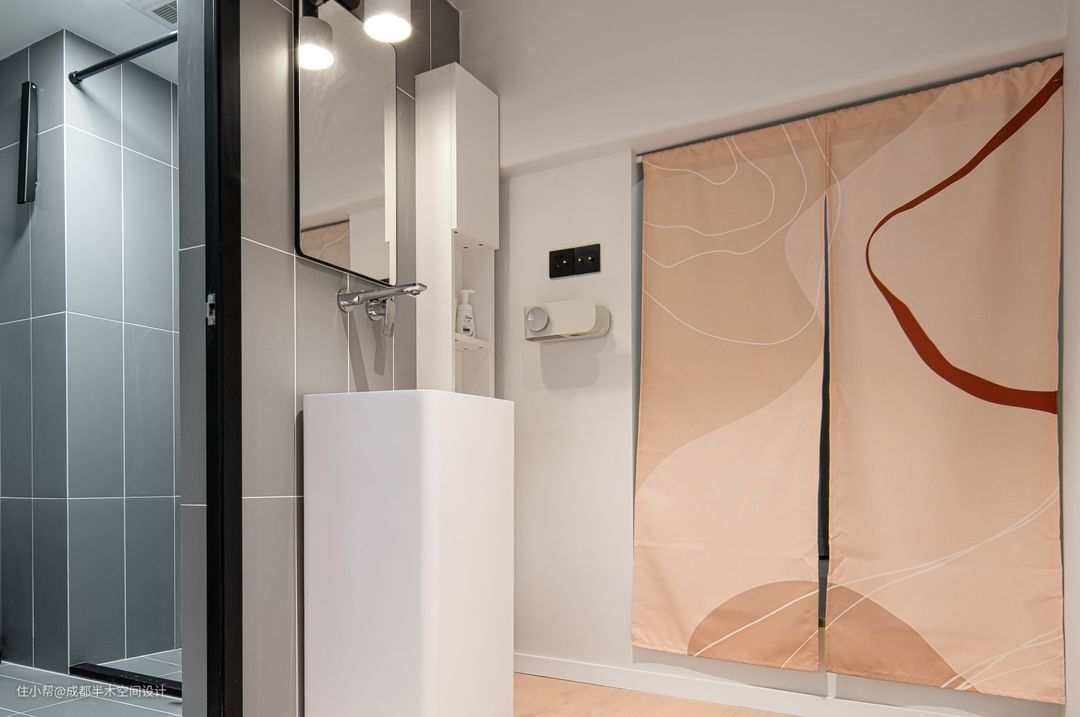 卫生间基本上算是极限尺寸了,采用了洗手台外置的方式来提升利用率。白色的立柱盆与空间协调,白色1.6高细长柜体满足收纳。