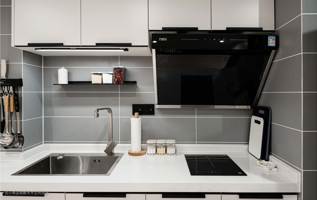 大显身手的精致小厨房。灰色哑光砖,搭配白色橱柜+吊柜,清新整洁,足够的收纳空间才能保证空间的整洁,避免杂乱感。