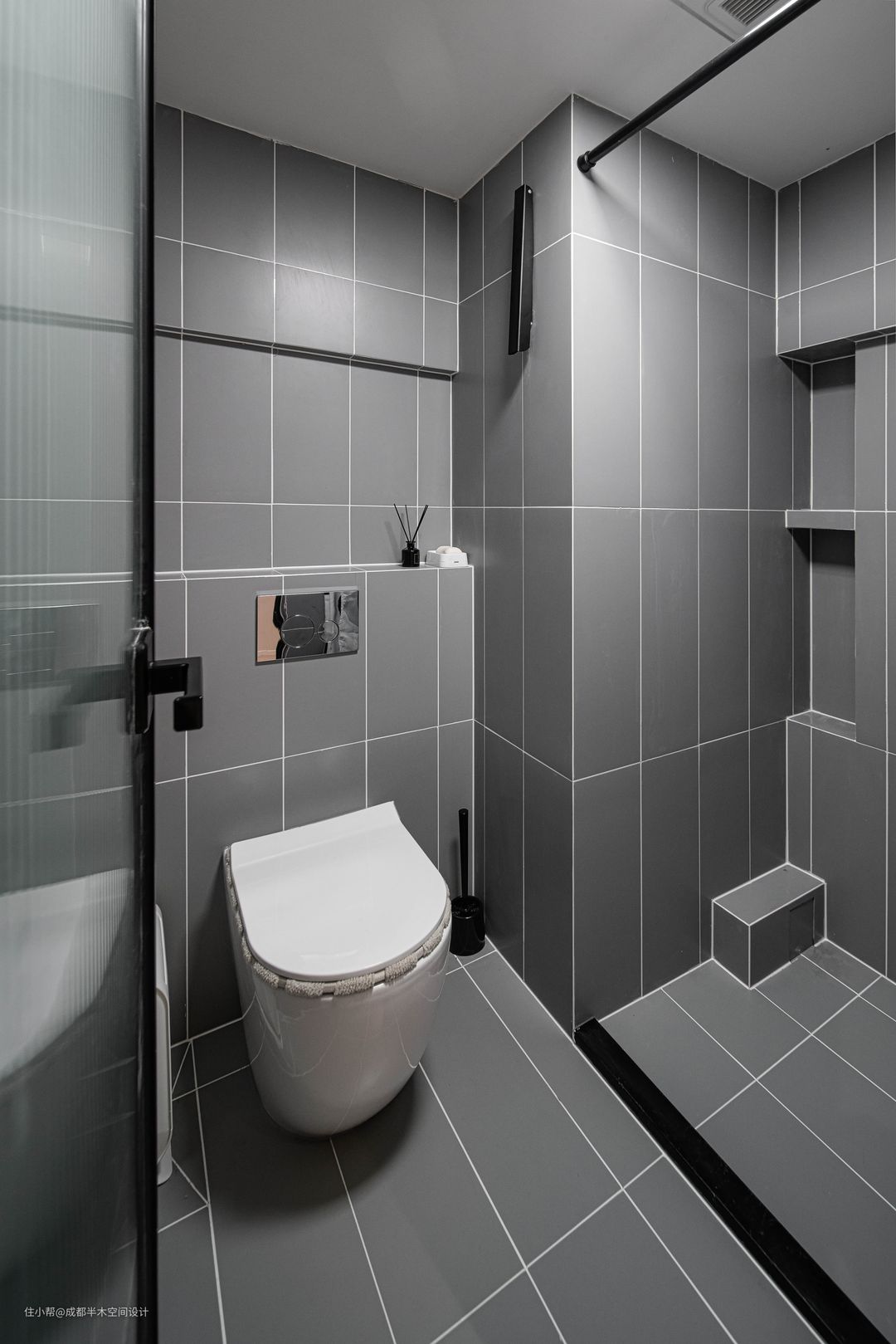 卫生间内采用壁挂式马桶,不留卫生死角同时利用马桶预埋水件做一个半墙,增加储物功能。淋浴区以浴帘分隔,通过壁龛来收纳储物,有效利用空间。