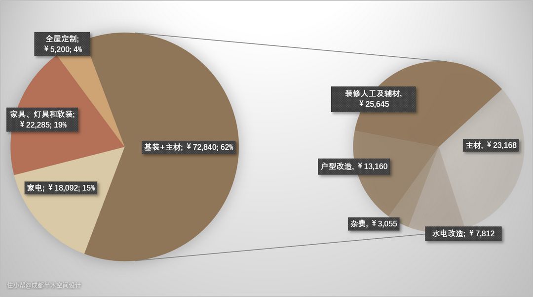 本案装修花费如图所示。初期装修预算为10W,实际花费11.8W,虽然略有超支但是控制得也很不错了!因为本案户型属于LOFT公寓,户型改造涉及搭建,这部分的花费是比较多的;另外就是改消防、办理装修手续等必须的额外杂费的支出,所以基装花费占比较高。不过后期也采取了很多省钱的办法,例如使用网购的组合式衣帽架来代替全屋定制的衣柜,节约了不少的预算呢😉