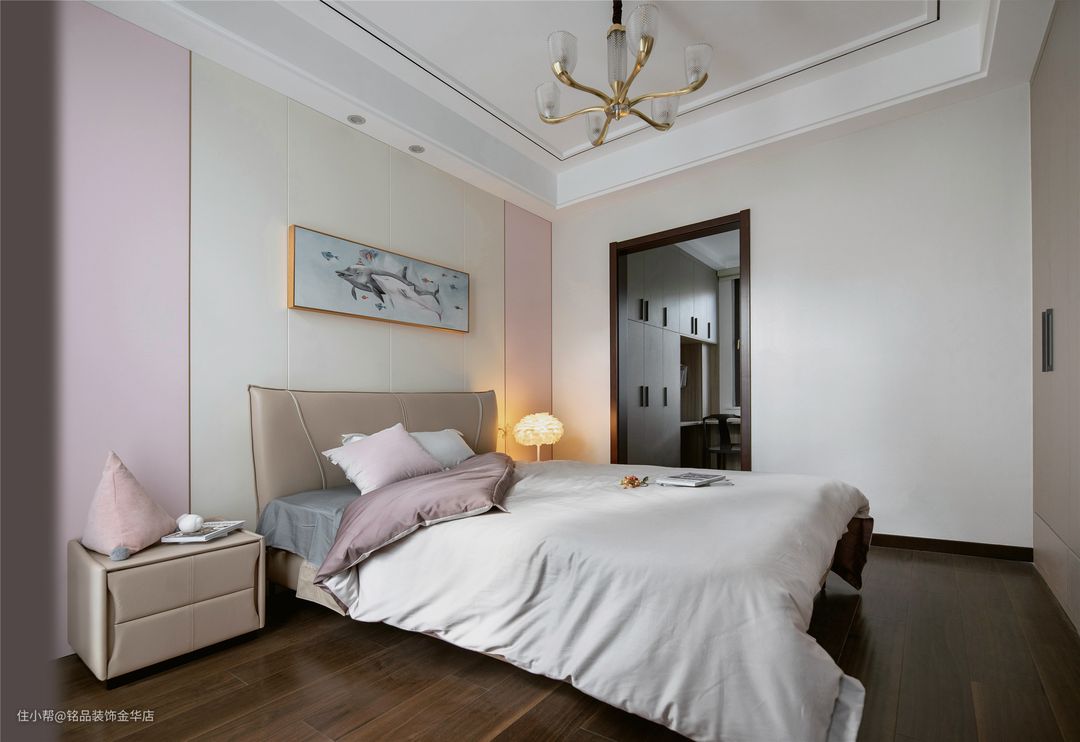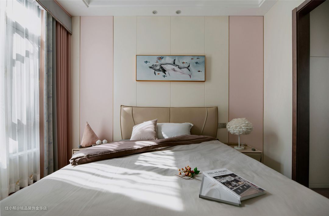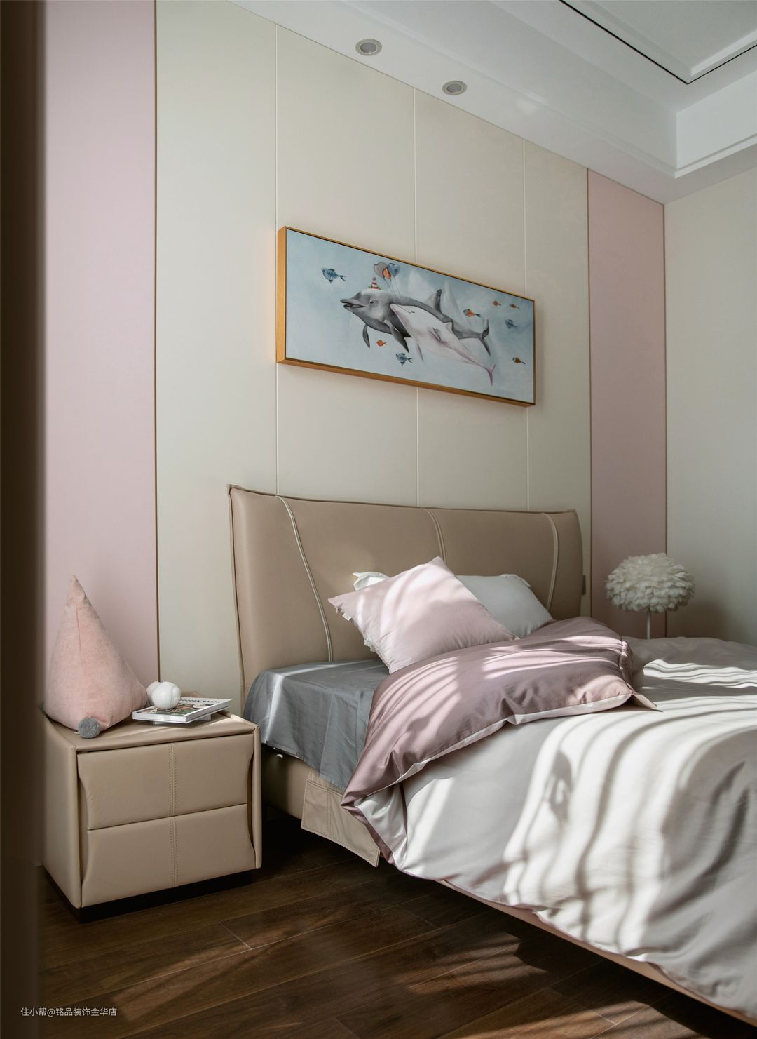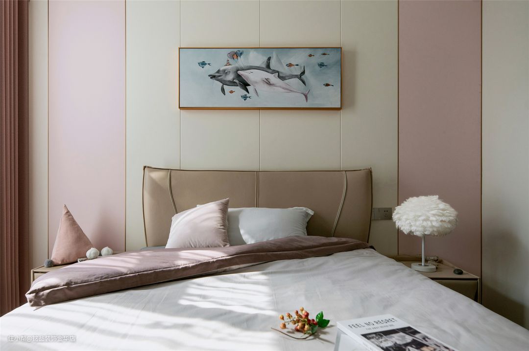 粉粉嫩嫩女儿房,粉+米白石膏板床头背景墙,综合金属边框的挂画,女儿房也是朝南设计,所以采光条件比较好,而且空间也足够大,利用了这一优势,单独隔出了一个衣帽间兼顾小书房的空间。