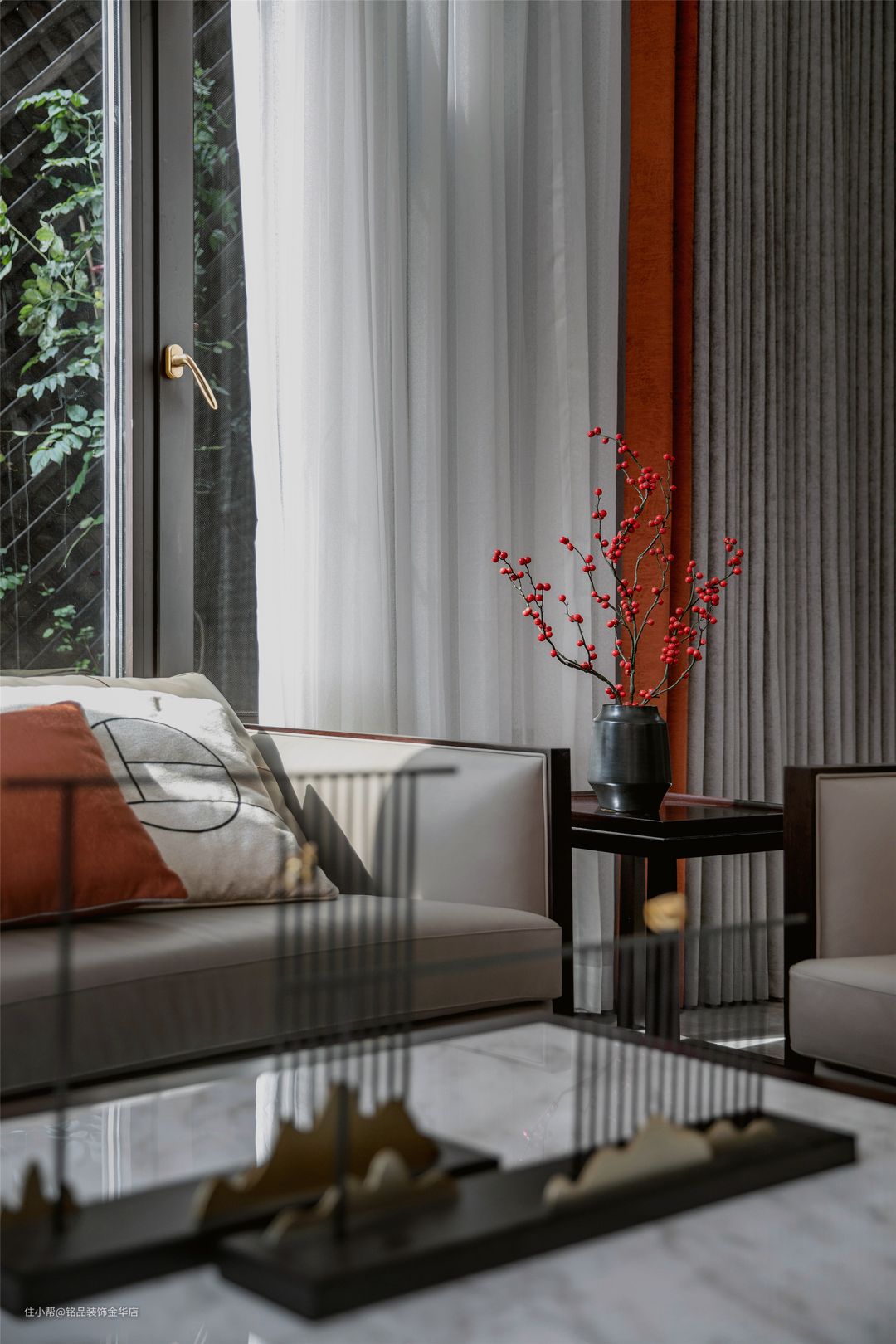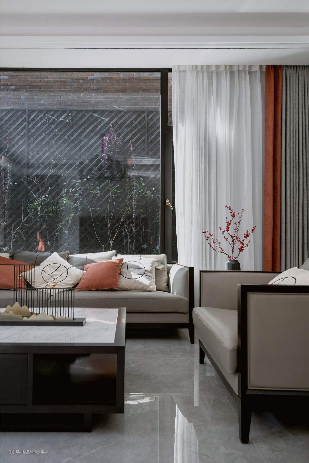 沙发背景墙以大面积落地窗为主,安装了电动窗帘,虚实结合,十分生动,拉开窗帘的时候可将户外花园场景一览无遗。添加了爱马仕橙抱枕作为客厅内跳色,制造了舒缓惬意的氛围。生意做的大了很多时候,对于风水也会更加讲究起来。我们提前预留了浴缸的位置,嵌入式玻璃鱼缸,不会占多余的空间,也让室内多了一丝生机活跃。