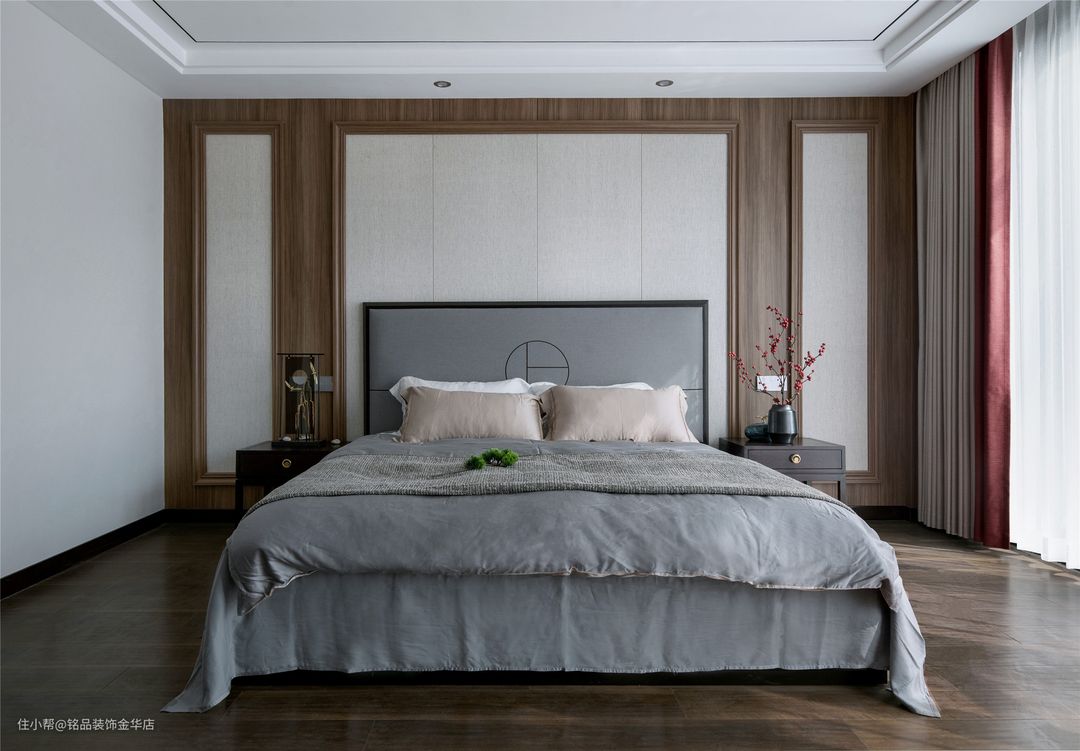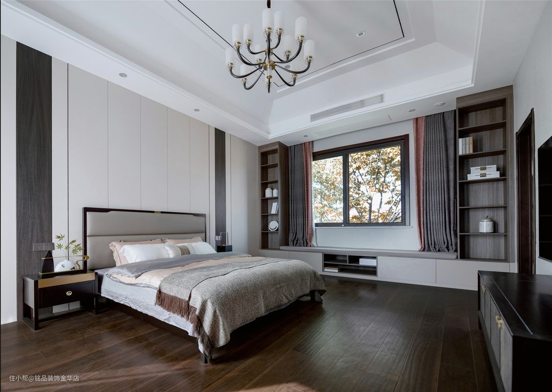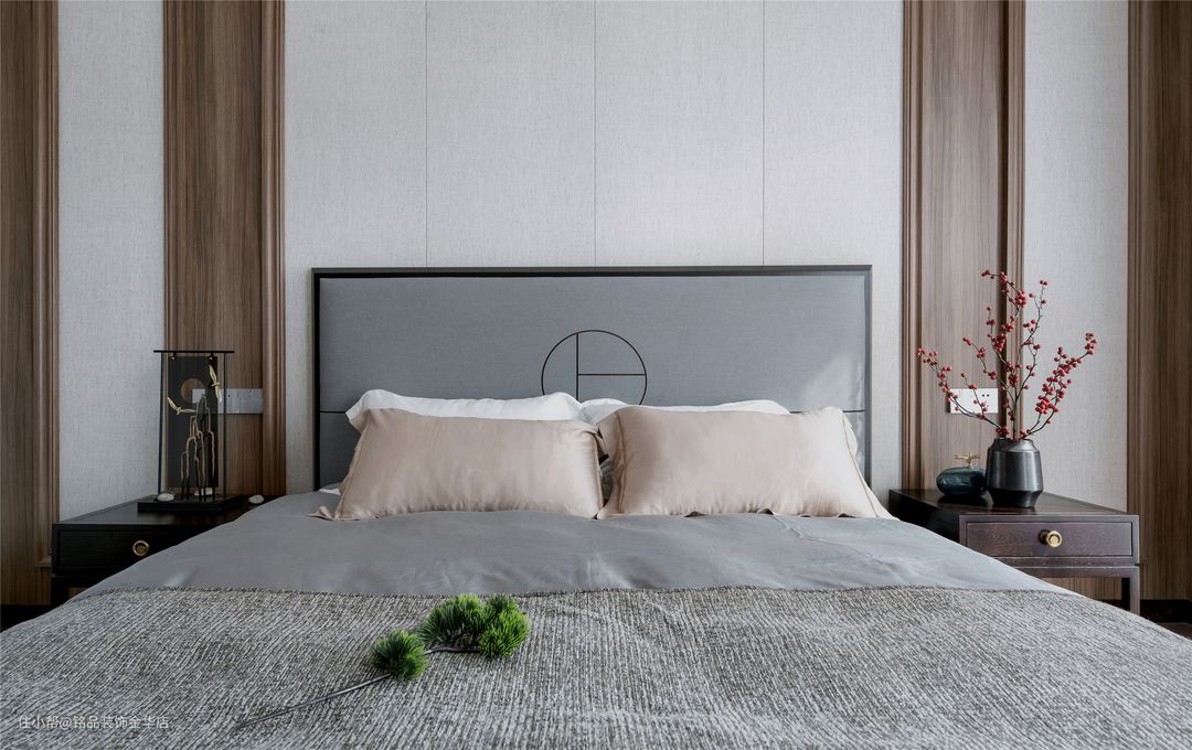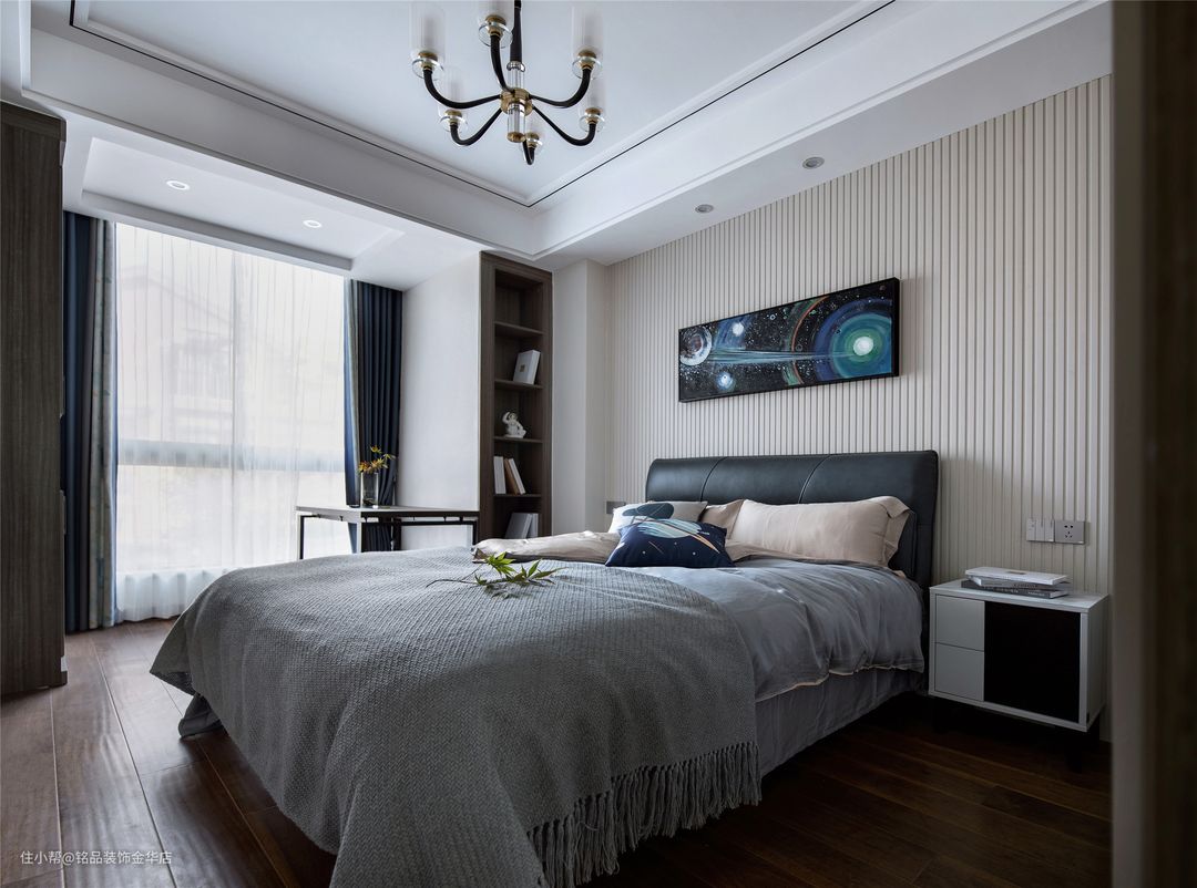 主卧比较宽阔,原木石膏板作为象牙白床头背景墙的边饰,勾勒出了良好的层次感,同时与深棕色的地板起到相互呼应的作用,丰富了视觉效果。软装床上用品还是以高级浅灰+米白,色差的综合碰撞彰显出传统与现代的格调。