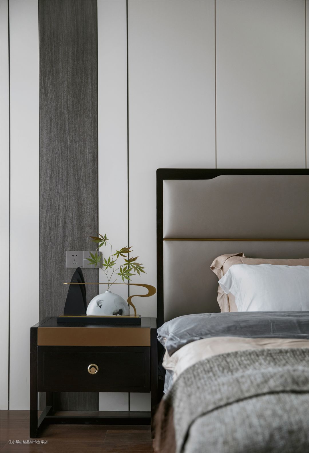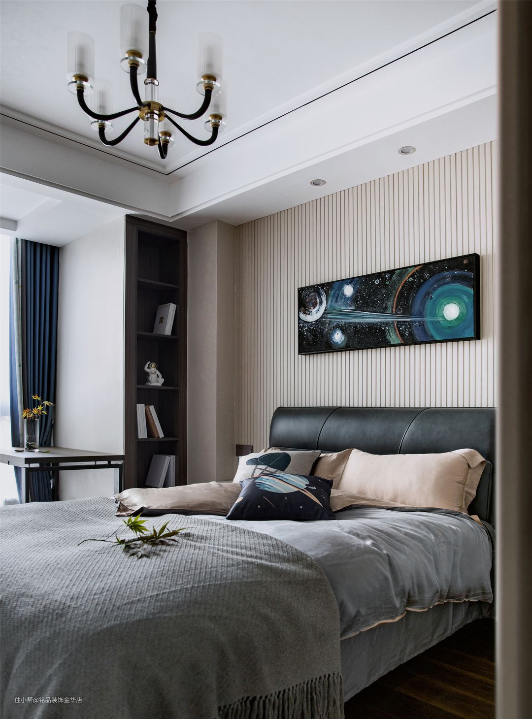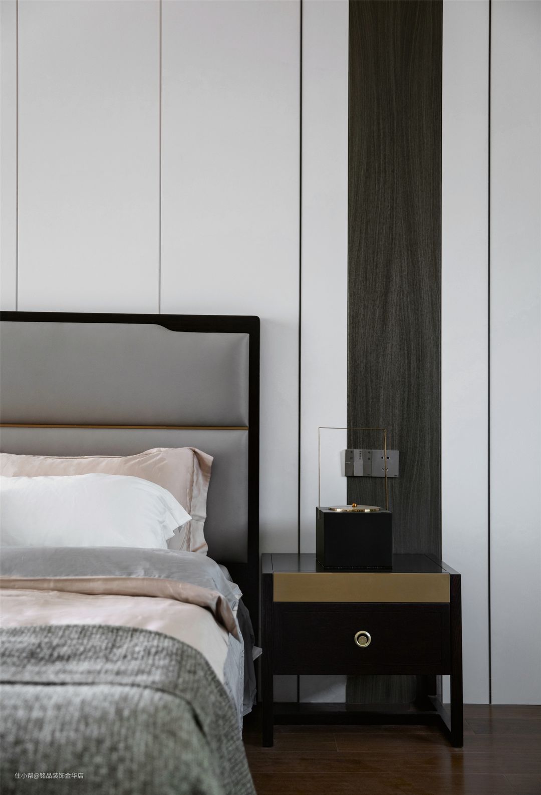 主卧比较宽阔,原木石膏板作为象牙白床头背景墙的边饰,勾勒出了良好的层次感,同时与深棕色的地板起到相互呼应的作用,丰富了视觉效果。软装床上用品还是以高级浅灰+米白,色差的综合碰撞彰显出传统与现代的格调。
