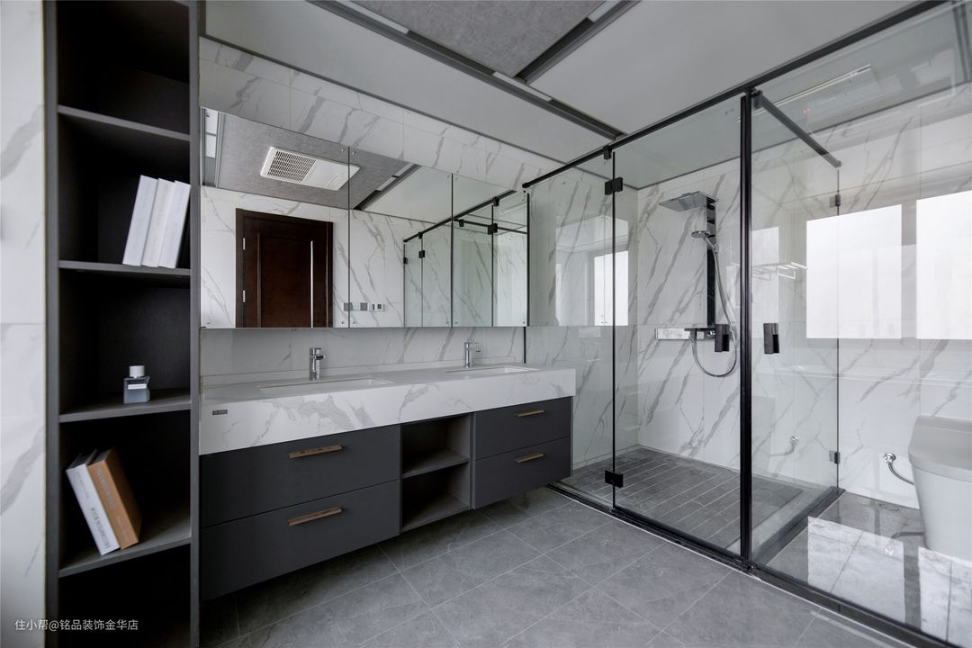 玻璃周边利用黑色边框装饰,水波纹的大理石釉面墙砖,防滑地板的安装极大提高了安全性能。
