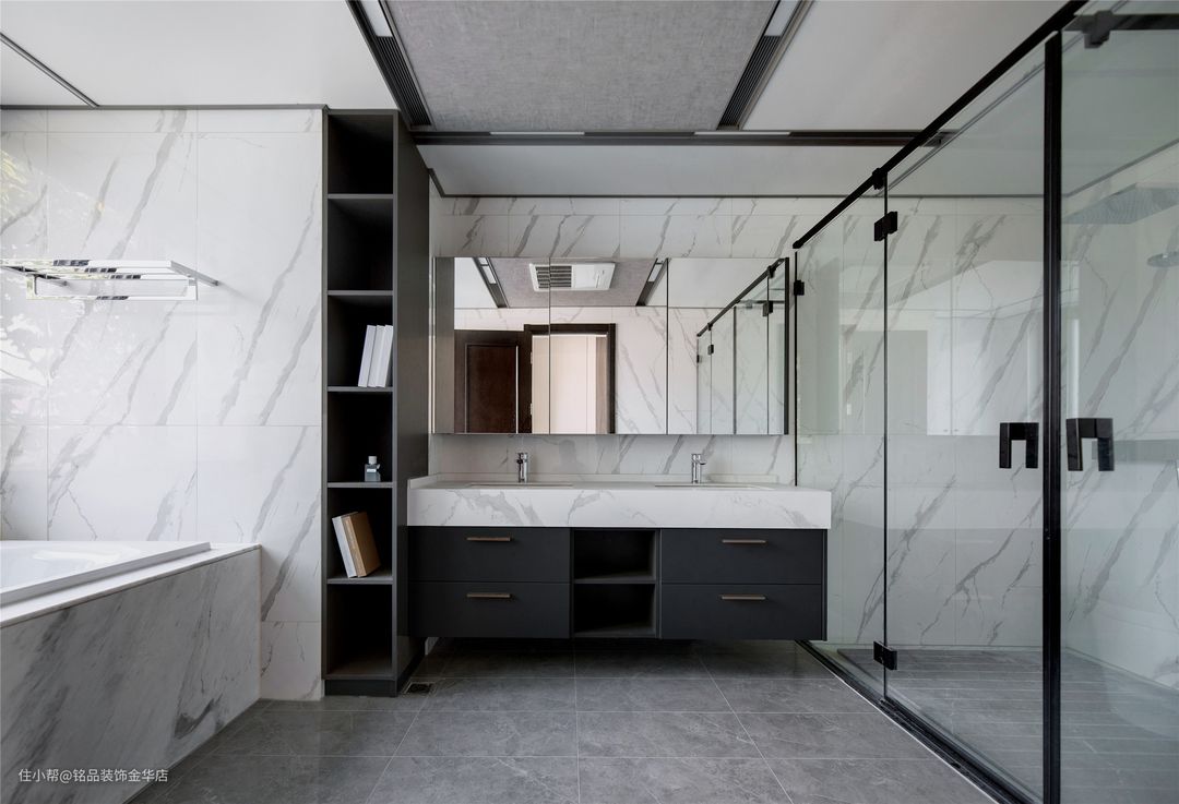 卫生间采用三分式设计理念,浴缸、洗漱台、淋浴区自成一体,动静分明,淋浴门采用玻璃门营造了通透宽敞的卫生间,从视觉上来看仿佛大了足足10㎡的样子。