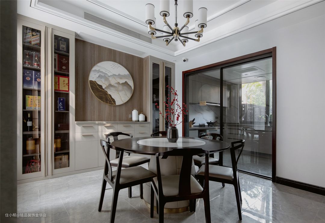 餐厅我们还是延续了客厅的设计理念,高级檀木圆餐桌椅,足以满足一家人共同进餐的座位需求。嵌入式橱柜的设计有效提高的墙面的实用性,而且缓解了视觉上的僵硬感,透明玻璃柜门起到放灰尘效果。