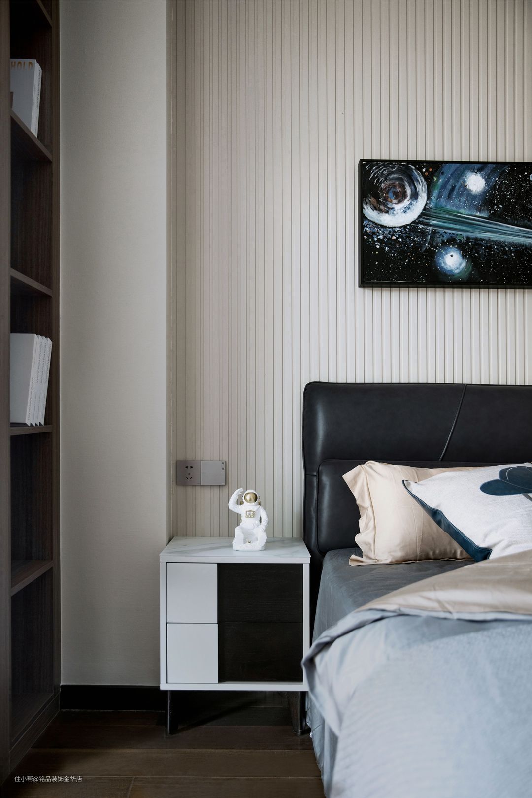 线性设计的床头背景墙,提前预留好了插座,方便后期手机充电之类的。灰面橱柜+黑色拉手,简约大方。