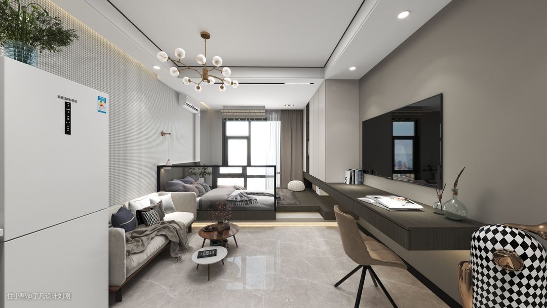 缩小卫生间空间,扩大公共区域,但是同时也要保证卫生间的空间舒适性。把就寝区域和客厅进行区域划分,明确功能分区。厨房和客厅共用空间,因为空间比较小,所以不能设置明确的餐厅区域,可以与客厅共用,比较灵活。