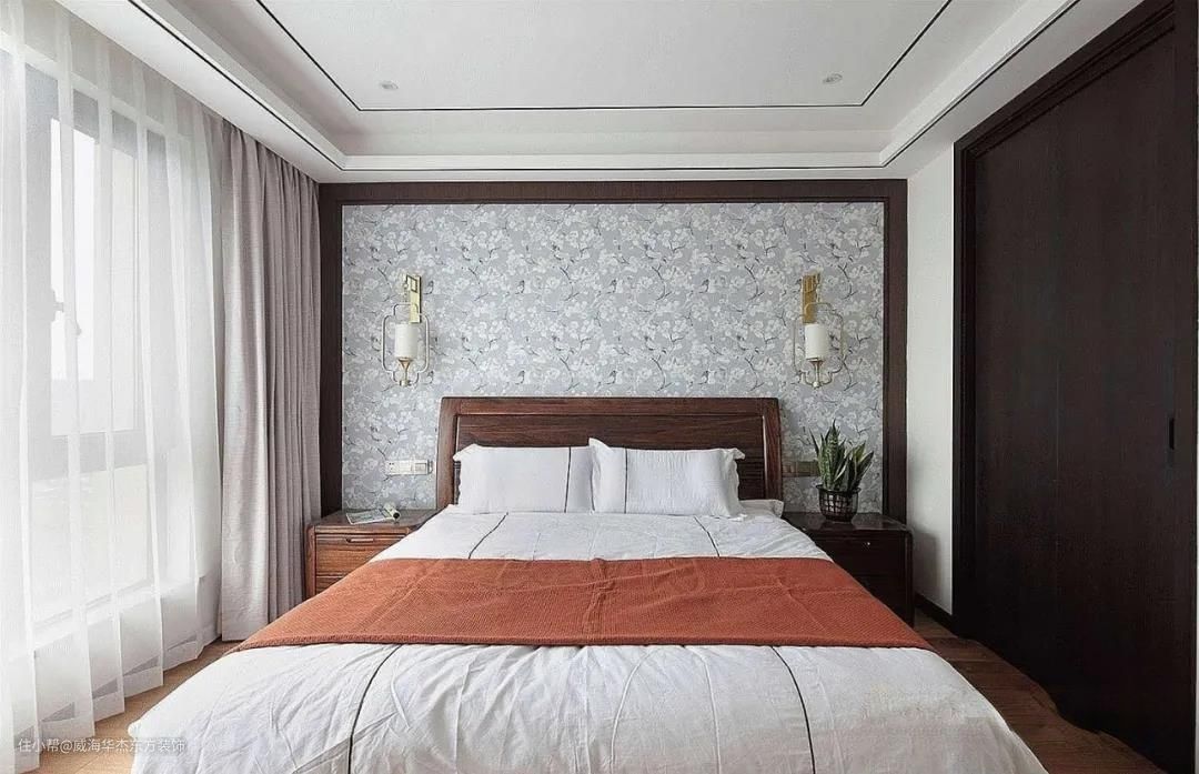 主卧空间木色地板搭配简洁吊顶,整体空间去繁从简;原木家具搭配碎花壁纸,两侧对称金色中式壁灯,含蓄雅致。侧面木饰面隐形门设计,展示出舒适又富有造型感的空间氛围。