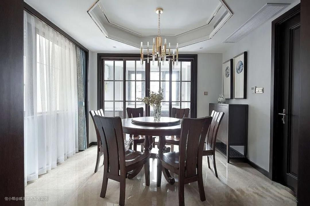餐厅多边形吊顶显得格外精致,中式圆桌塑造圆润、圆满的意象,搭配同一色系的餐边柜以及对称装饰画,增添空间的中式韵味。木框玻璃推拉门将厨房和餐厅进行隔开,既能增强空间采光,又能防止做饭时油烟扩散的问题。