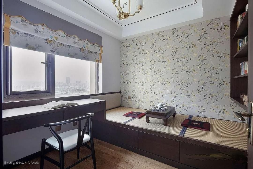 次卧榻榻米结合书桌设计,一侧是开放式展示架收纳书籍,储物空间充足,也满足工作休息两不误的生活方式。