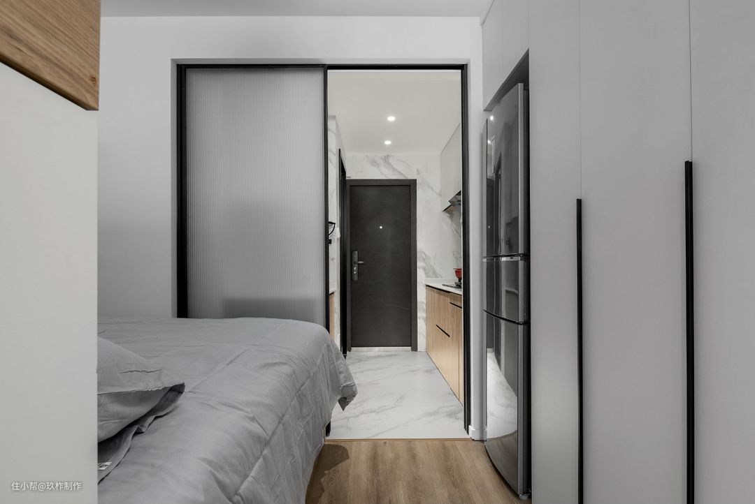 ▲左边靠墙一侧做顶天立地的柜子,高处空间全部做收纳,外面看不到任何杂物,增加收纳空间,是小房子越住越大的法宝。