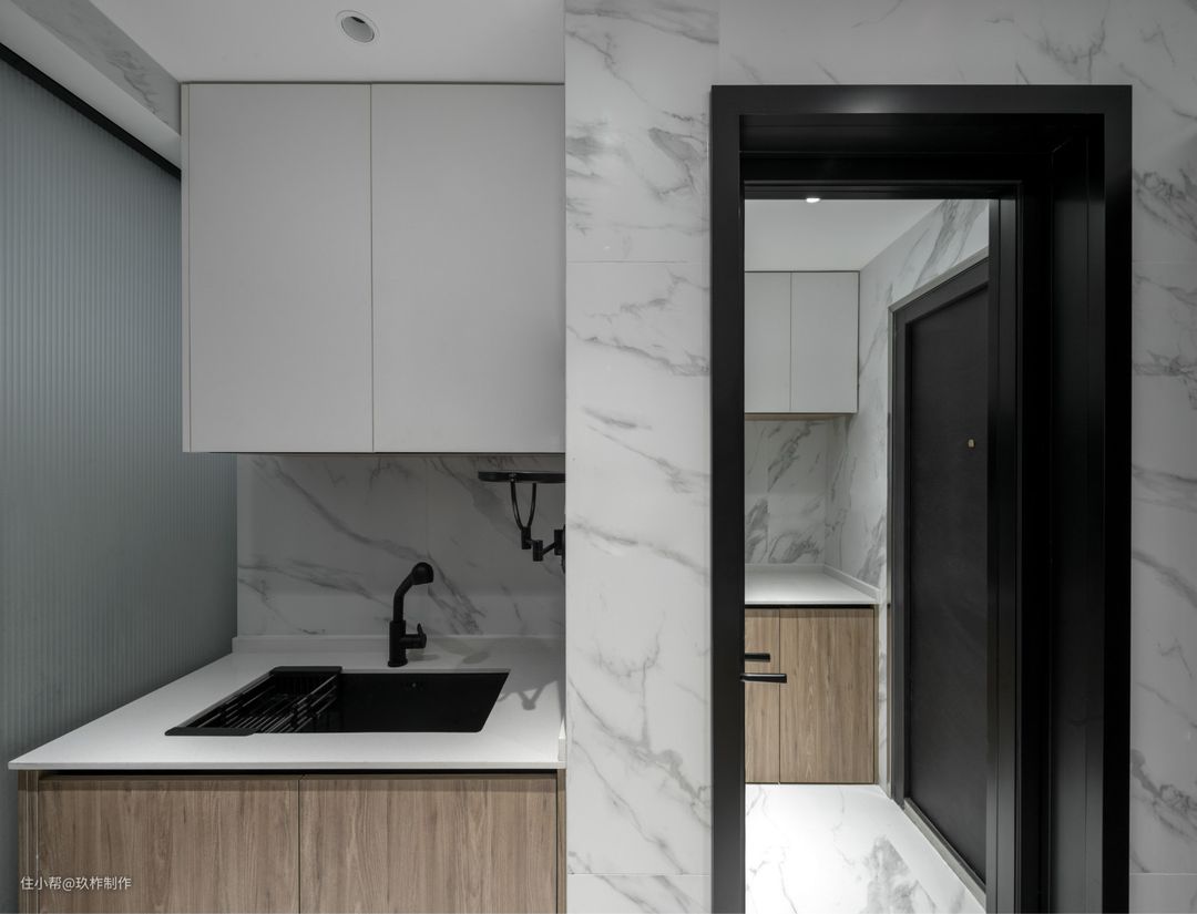 ▲进门处,就是厨房和卫生间的空间。设计师适当调整了两块区域的大小,把厨房的部分空间调整出来改造成了一个洗手台,也完成了卫生间的干湿分区。