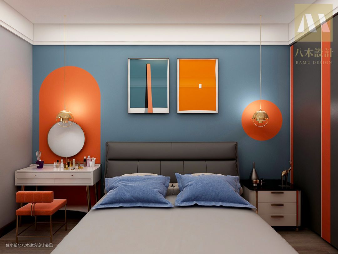 卧室我们尽量会把整体做的比较简单一些,因为卧室的主要功能是用作休息的,做的太复杂长时间会造成审美疲劳,所以我们只做一些点缀同时把握住整屋的色彩整体性就行了。