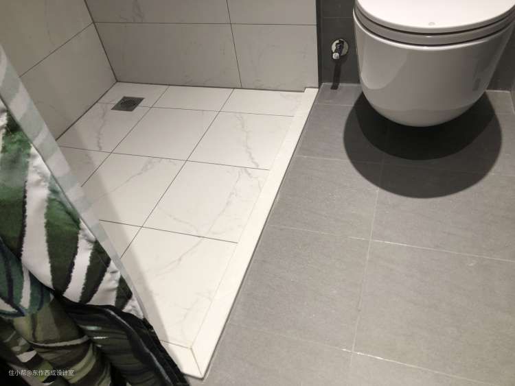 淋浴区做了高低差,通过白色大理石来衔接。