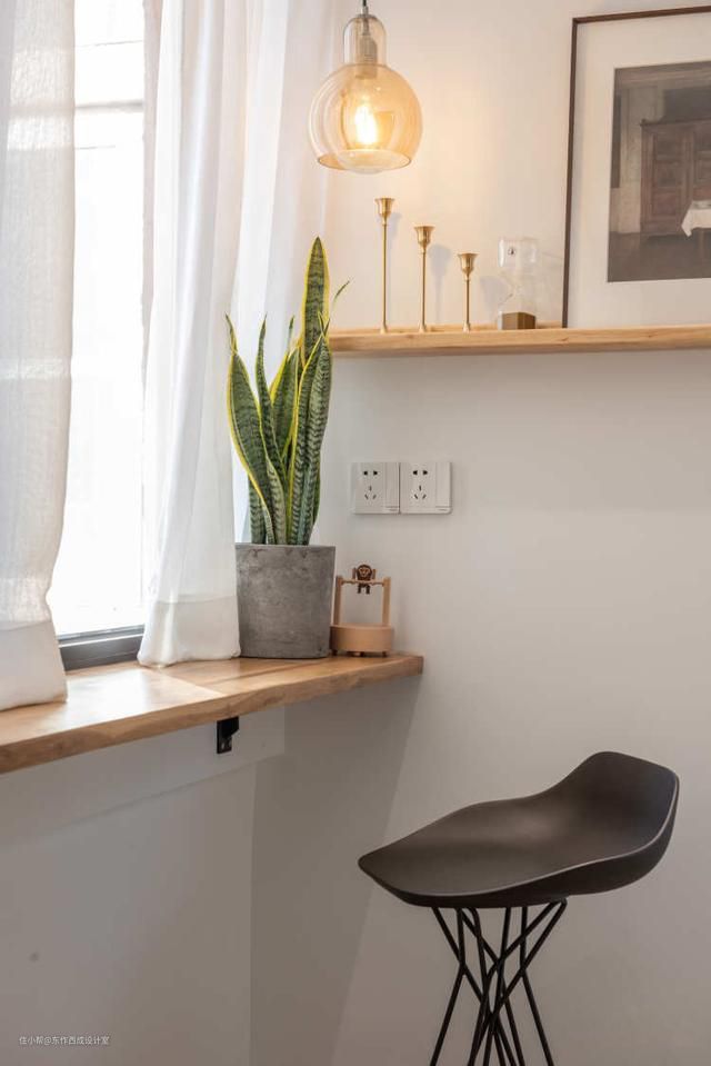 这里原本是厨房的阳台,因为一个无意看到的结构图,发现了这段承重墙原来是施工洞,于是打通了这块,把空间划入客厅,让客厅拥有了双重阳光☀️☀️ 裸露的下水管道被刷上了均匀的金属漆,业主不想让包管占用太多空间,因此好的油工很重要。实木台面和隔板是一家熟悉的店铺网购的,省去了铺大理石的费用,