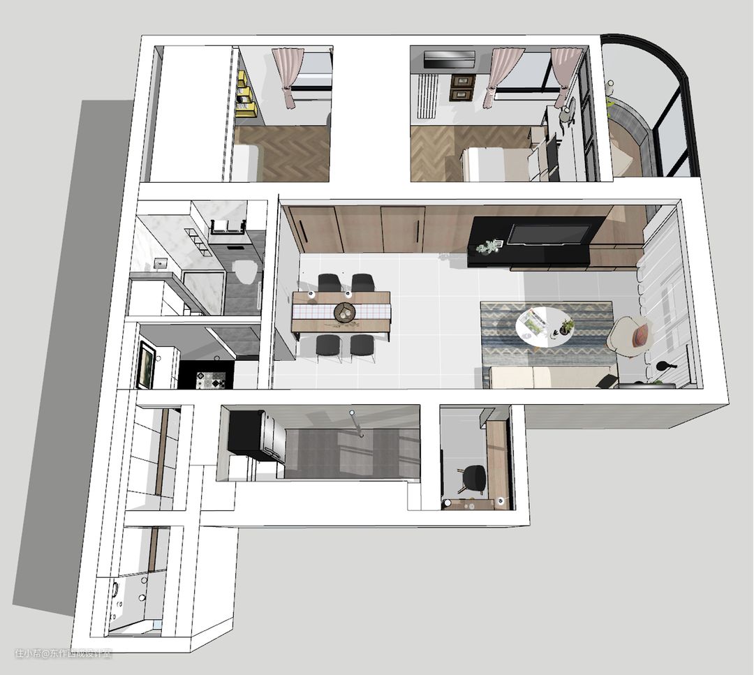 改造: 【1】厨房入门改到西面(户型朝西向),原始位置的对面。 【2】打通厨房阳台的北侧墙,与客厅贯通,原阳台变身view吧台,既可临时用餐,又能看风景,为客厅和厨房两处采光。