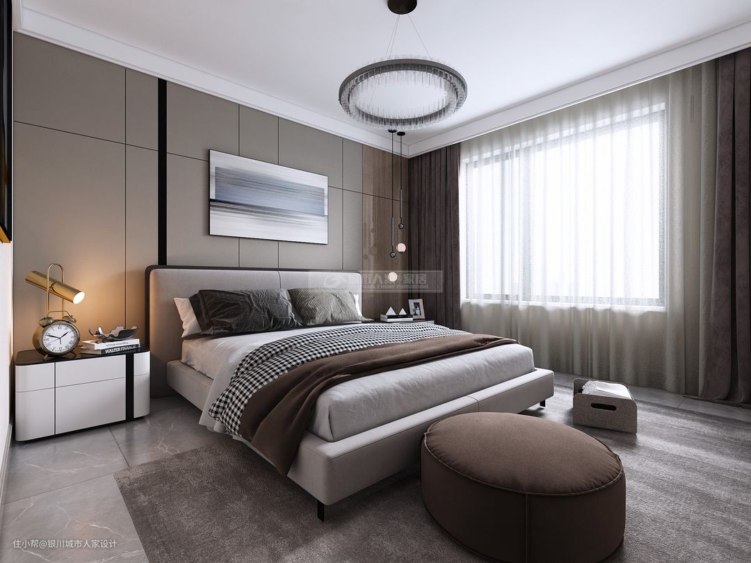 卧室床头是深色的背景,挂上极简黑白抽象画,布置灰色布艺床铺,在低调但高级的空间下,呈现出一种简约舒适的惬意感。